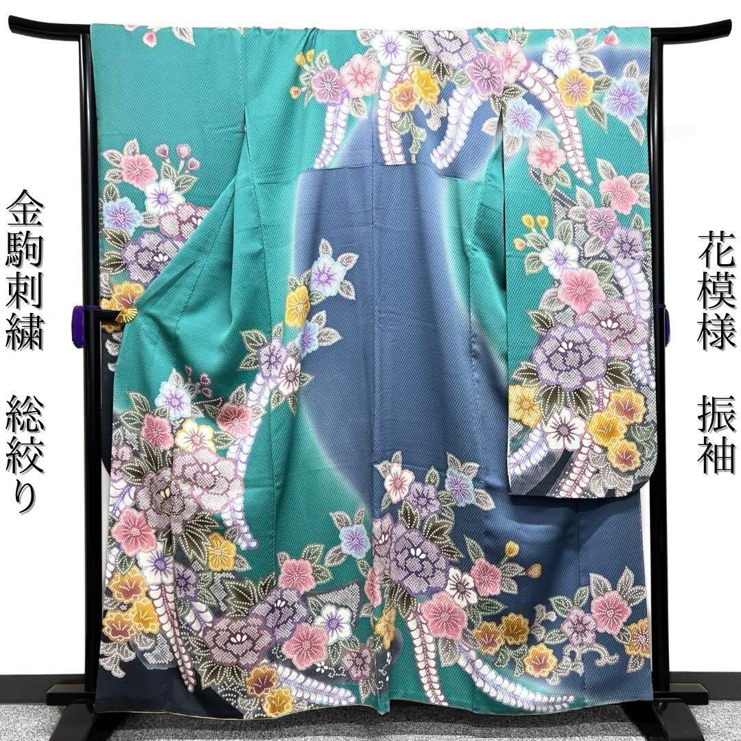 総絞り エメラルドグリーンに花が描かれた振袖 金駒刺繍 着物 成人式 晴れ着
