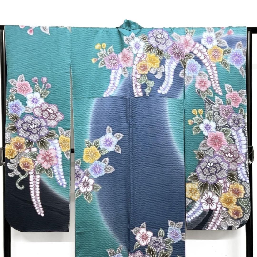 総絞り、エメラルドグリーンに花が描かれた振袖です。