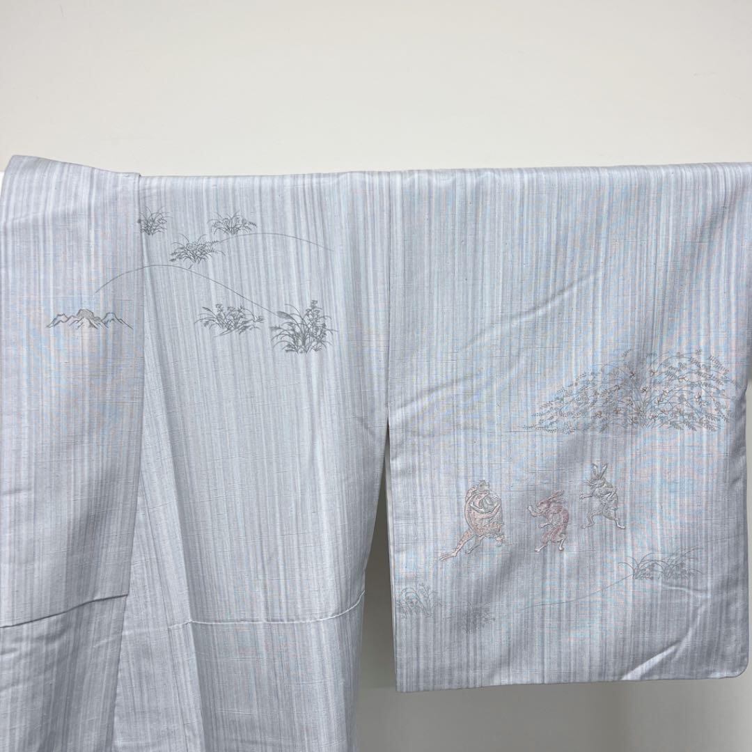 薄水色に鳥獣戯画が刺繍された紬の付け下げ 着物