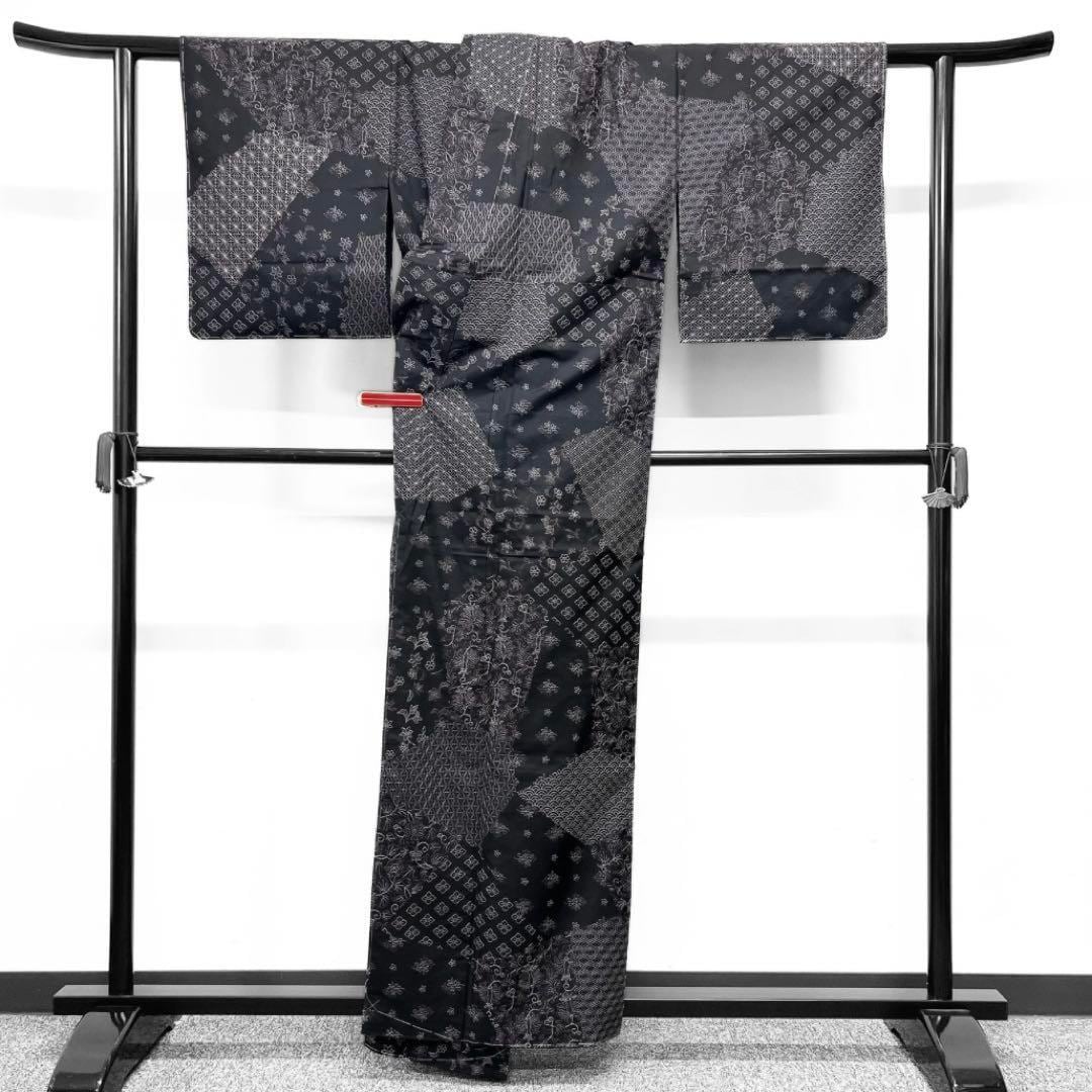 【逸品】 総刺子の黒地の大島紬の付け下げ小紋 着物
