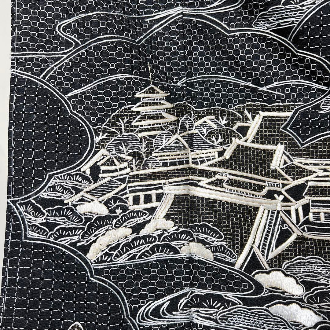 総スワトウ、総刺繍、黒地に京都が刺繍された訪問着です。雲模様に二種類の刺繍が施されており、金閣寺や清水寺等の京都の建造物と風景が着物全体に描かれた趣のある美しい一着です。