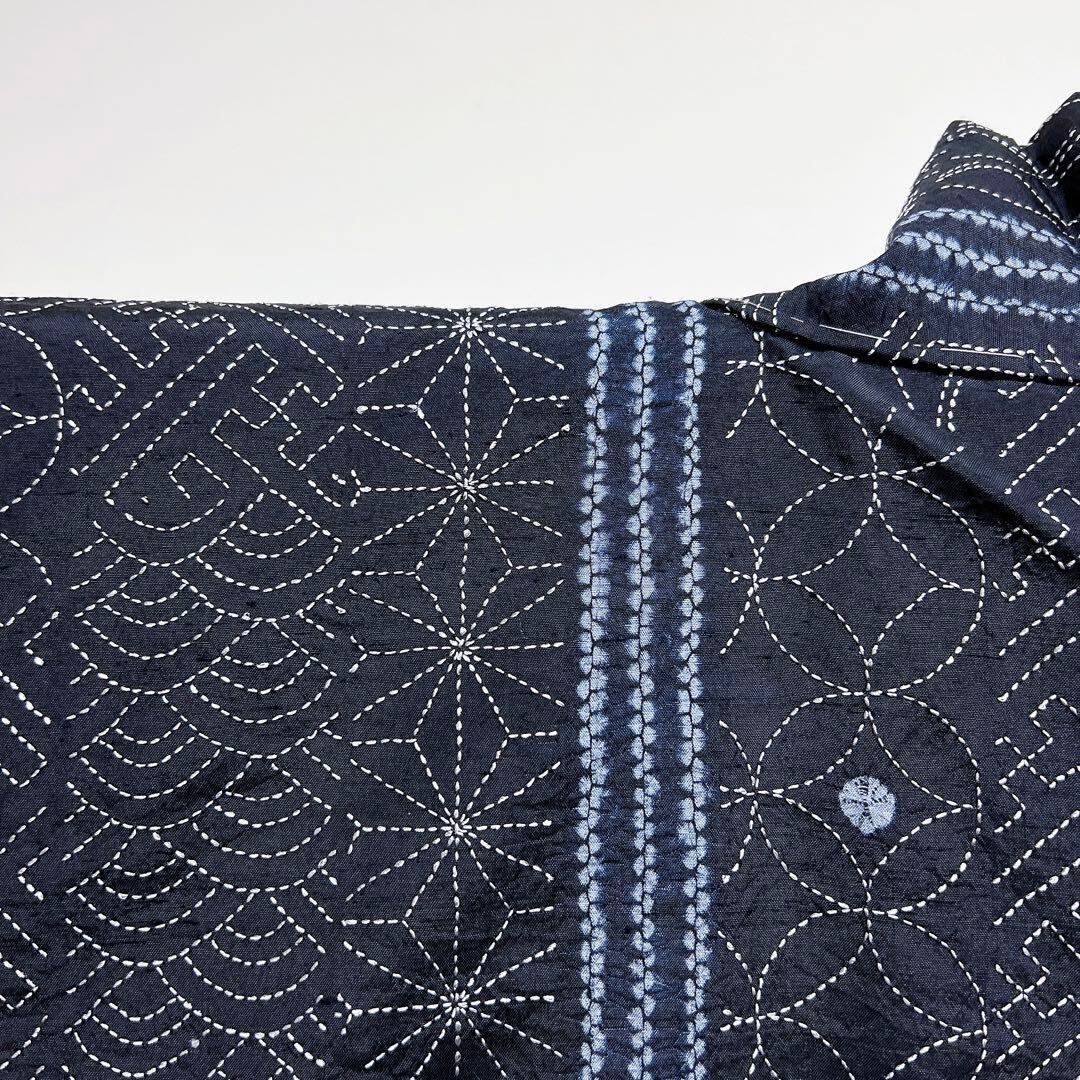 黒地に白い糸の刺子が美しく、絞りの藍色が美しい逸品となります。