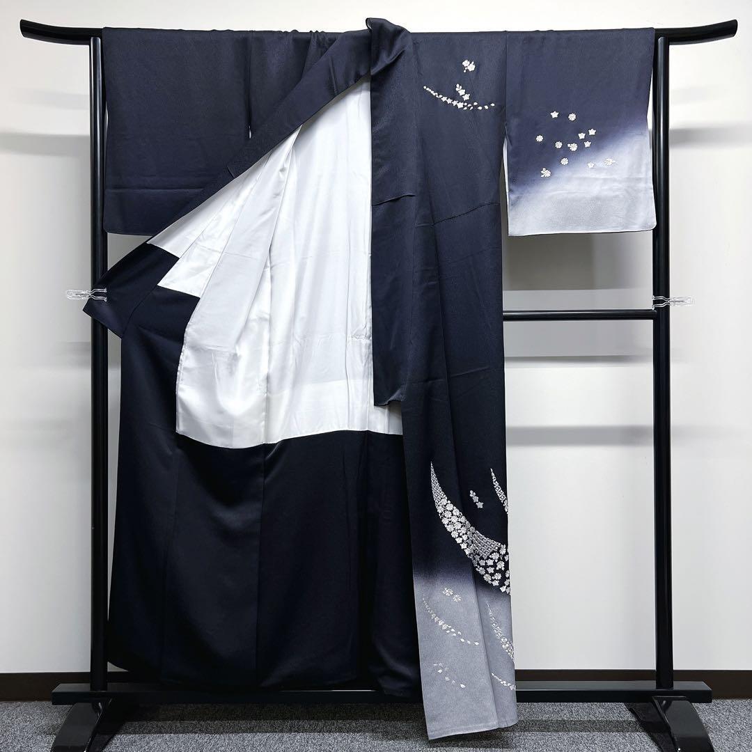 黒地に花の地紋、白色のさまざまな小花と七宝柄の訪問着です。