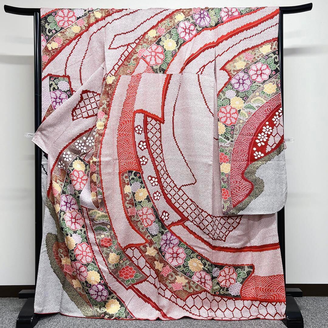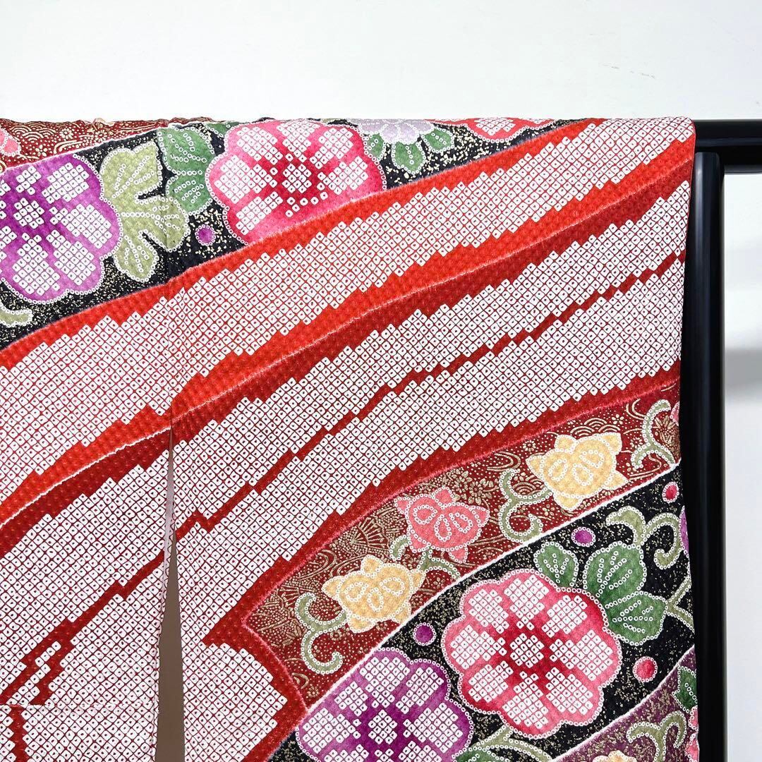 朱色に色鮮やかな小花と金駒刺繍が入った花模様が華やかな一着です。