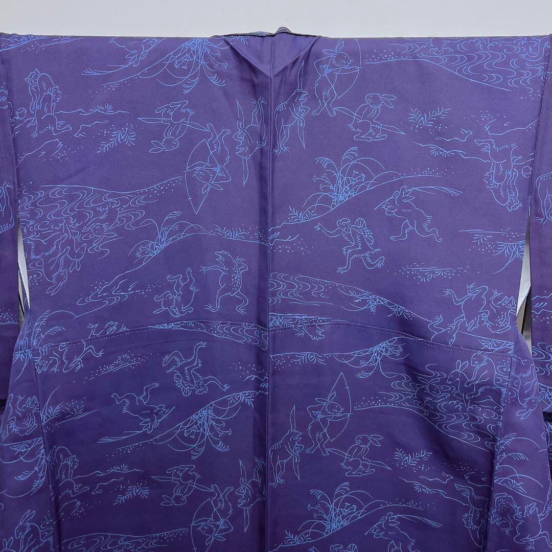 上品な藍色に弓を持ったウサギ、カエルなどの鳥獣戯画が味わいのある一着となっております。