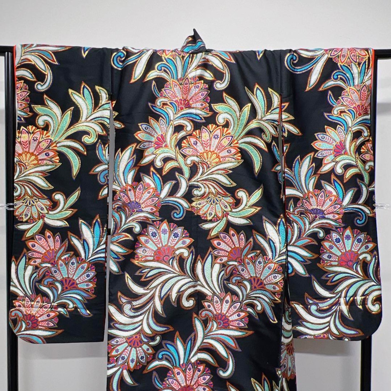 黒地に色とりどりの大きく織られた唐花模様が特徴的で壮大で優美に魅せる一着となっております。