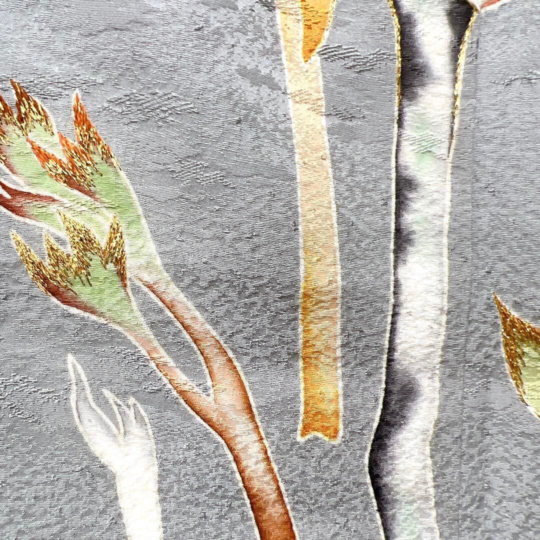 くすみのあるグレー地に季節を感じる色とりどりの草花のつぼみが味わい深い一着となっております。