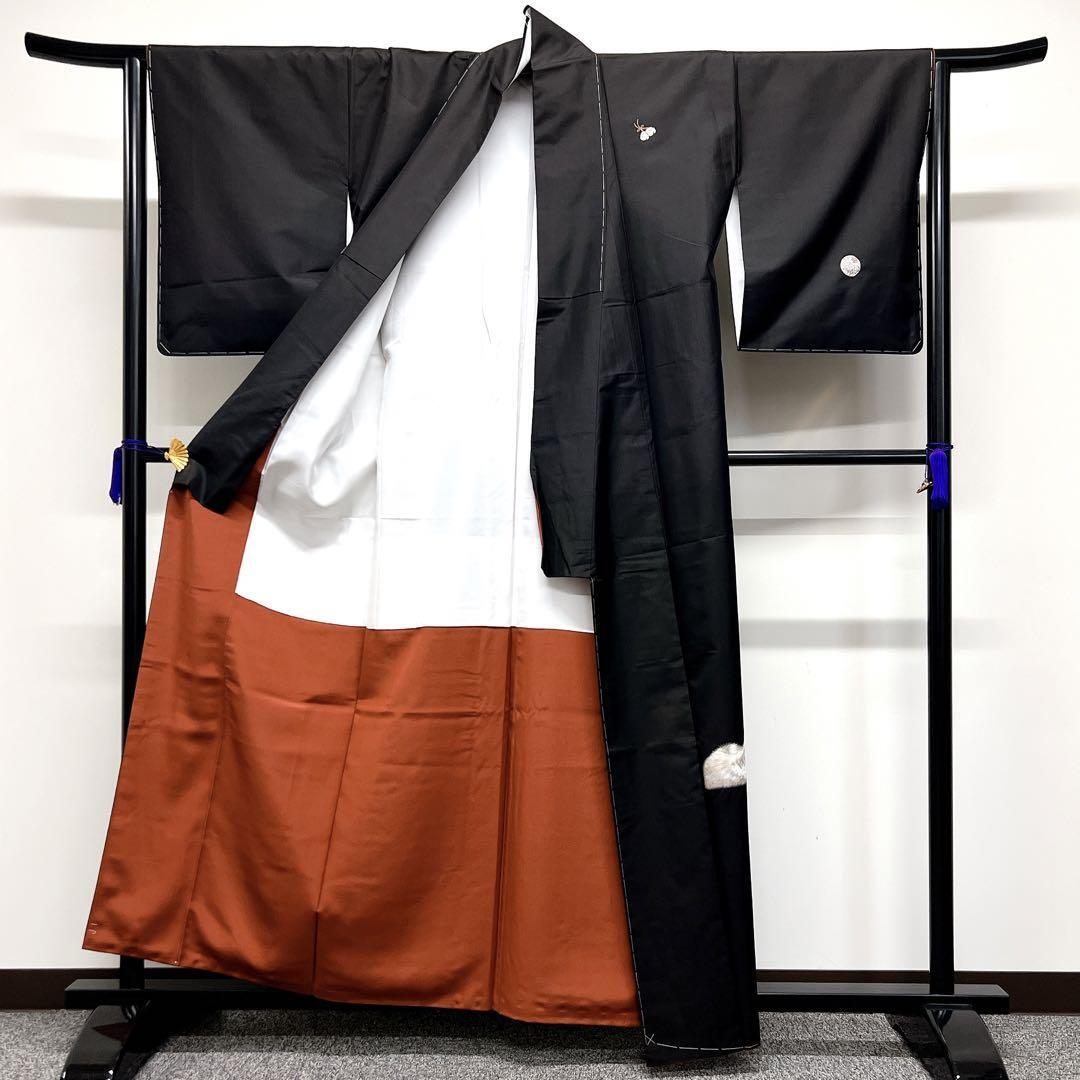 ダークチョコレートカラーにワンポイント刺繍の鞠と鈴柄が施され、上前には大きな白い犬の刺繍が織られた希少かつ味わいのある一着となっております。