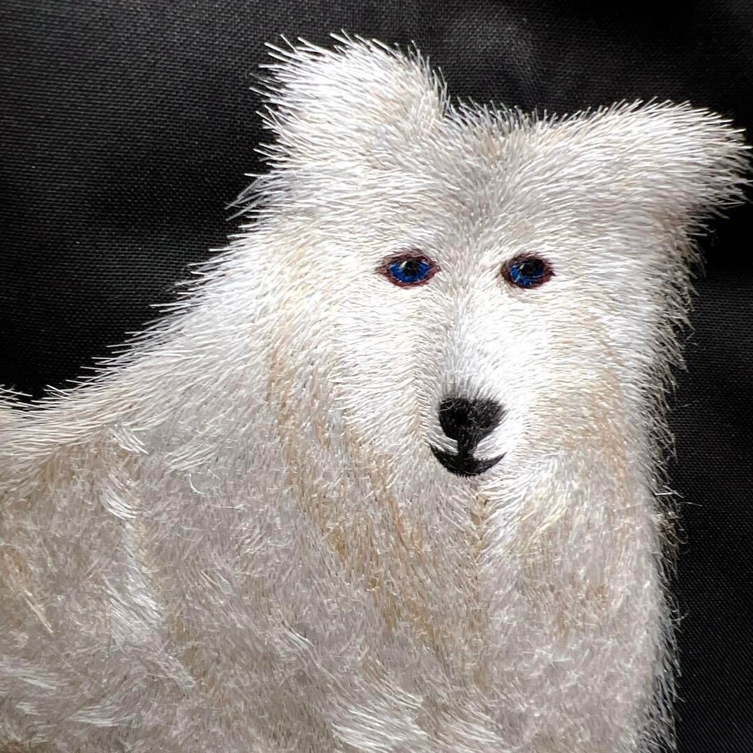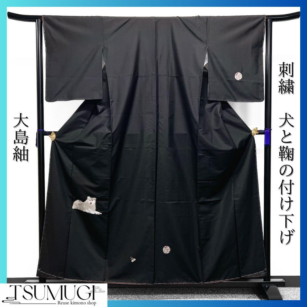大島紬の犬と鞠の刺繍があしらわれた付け下げです。