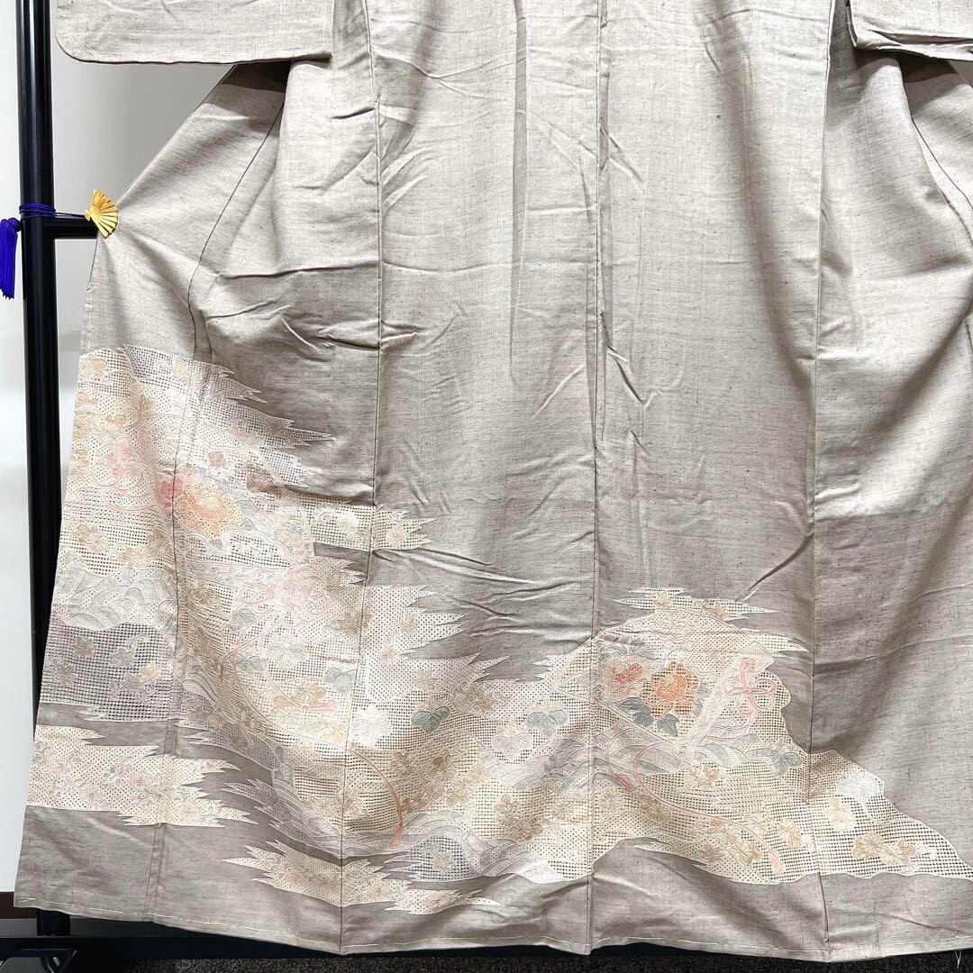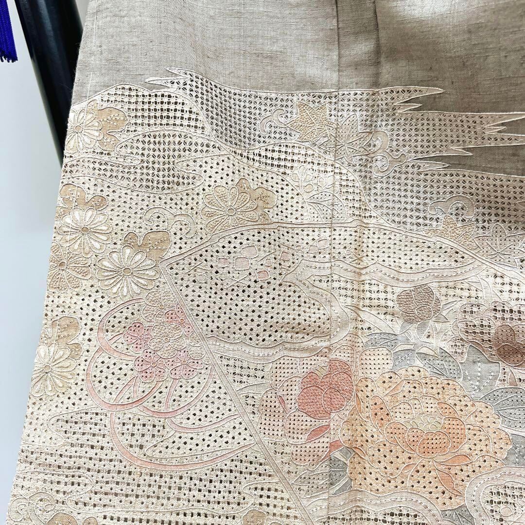 グレーに近いベージュの紬地にスワトウ刺繍で織られた雲に霞と扇、水引に桐の花や菊、楓が織られた華やかでお洒落な逸品です。