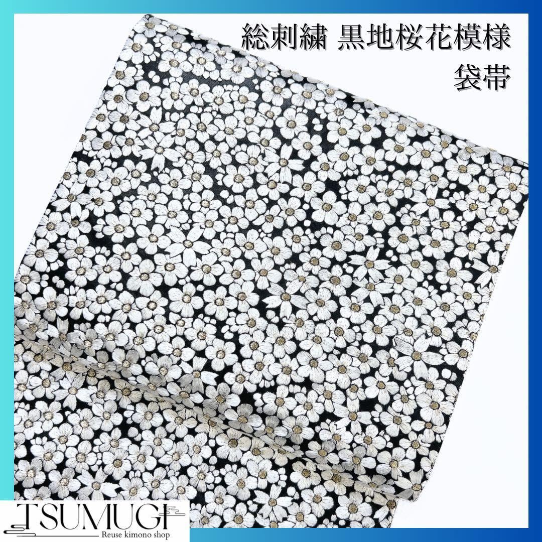 【逸品】総刺繍 黒地に桜花模様の袋帯 着物 103w