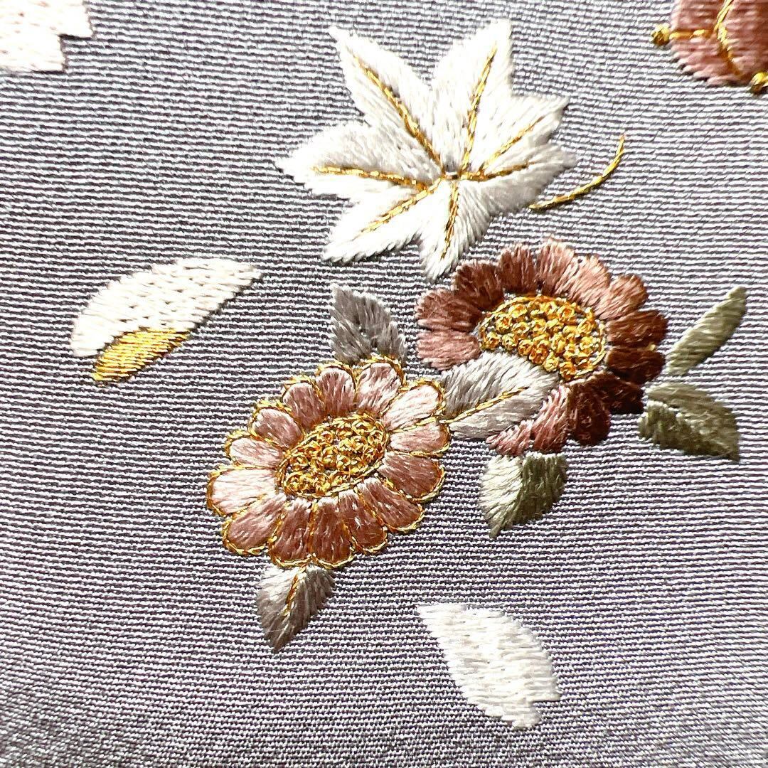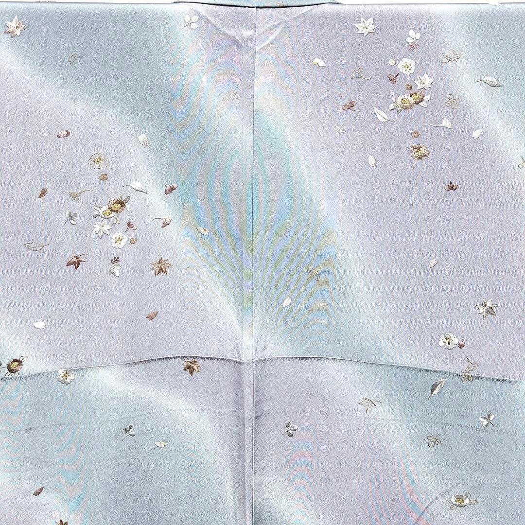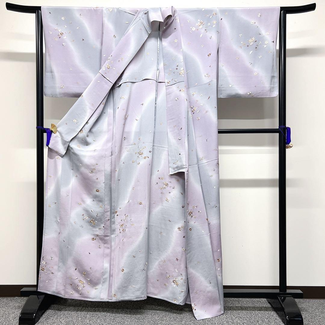 斜め霞のグレーとくすみ紫のグラデーション地に梅や菊、楓、萩、銀杏、菊が全て刺繍で織られた華やかな一着です。