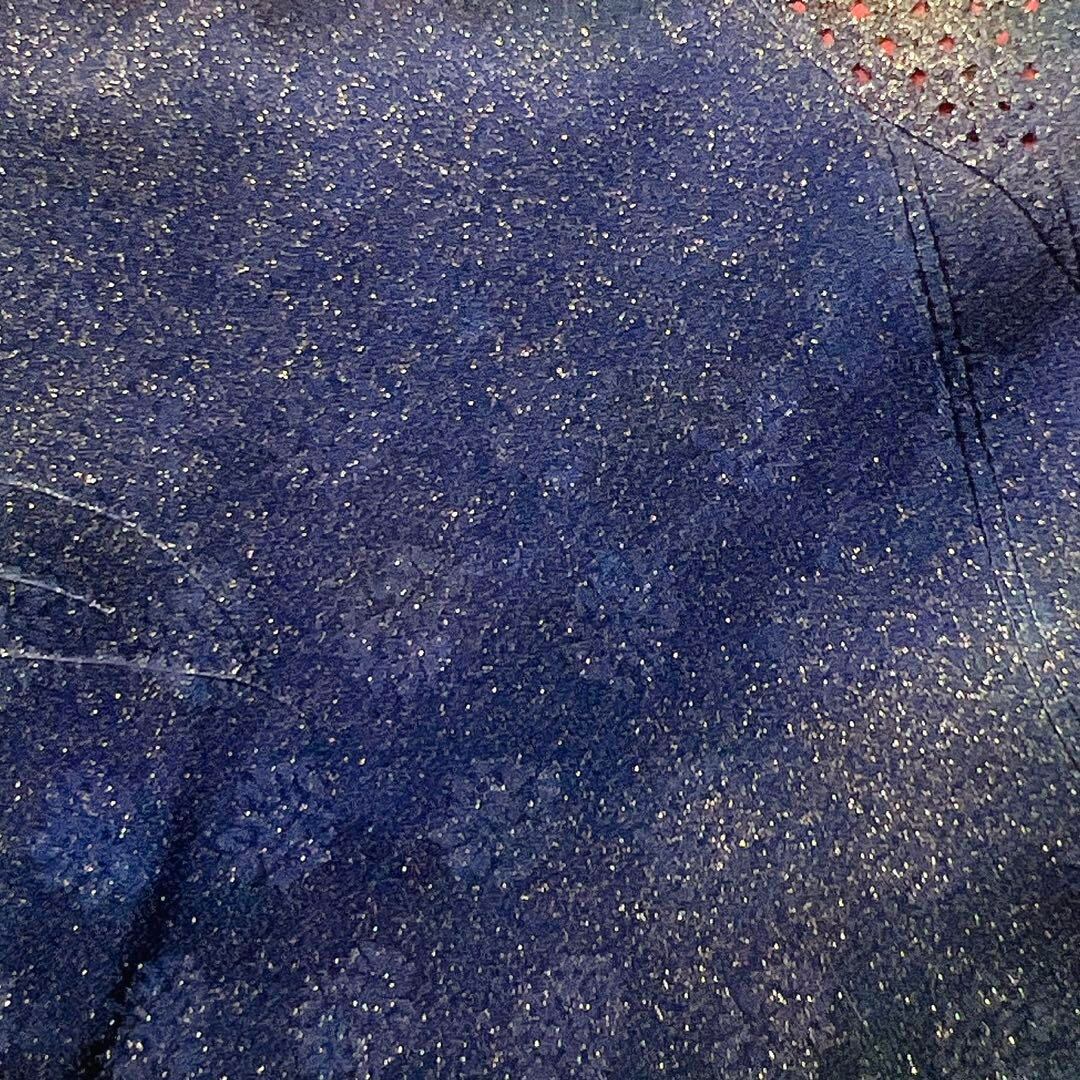 金通しと金粉による金彩でまるで宇宙の様な幻想的なぼかし染め地リーフと枝の文様が全てスワトウ刺繍で織られたお洒落で華やかな逸品です。