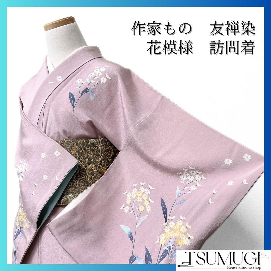 薄い紫色地に友禅で描かれた花模様が華やかな一着です。