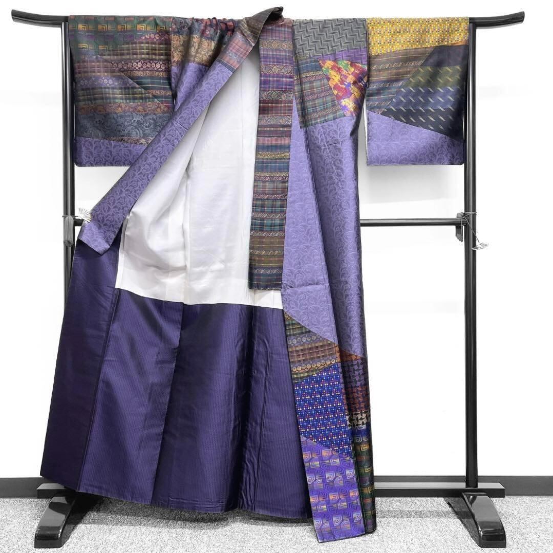 唐草の紫地に切り嵌めで描かれたチェック模様や幾何学模様、唐花、猫、帆船、羅針盤、人魚、地球儀、ライオン、ユニコーンなどの文様が織られた訪問着にエジプト文様やペイズリーが切り嵌めで織られた袋帯です。