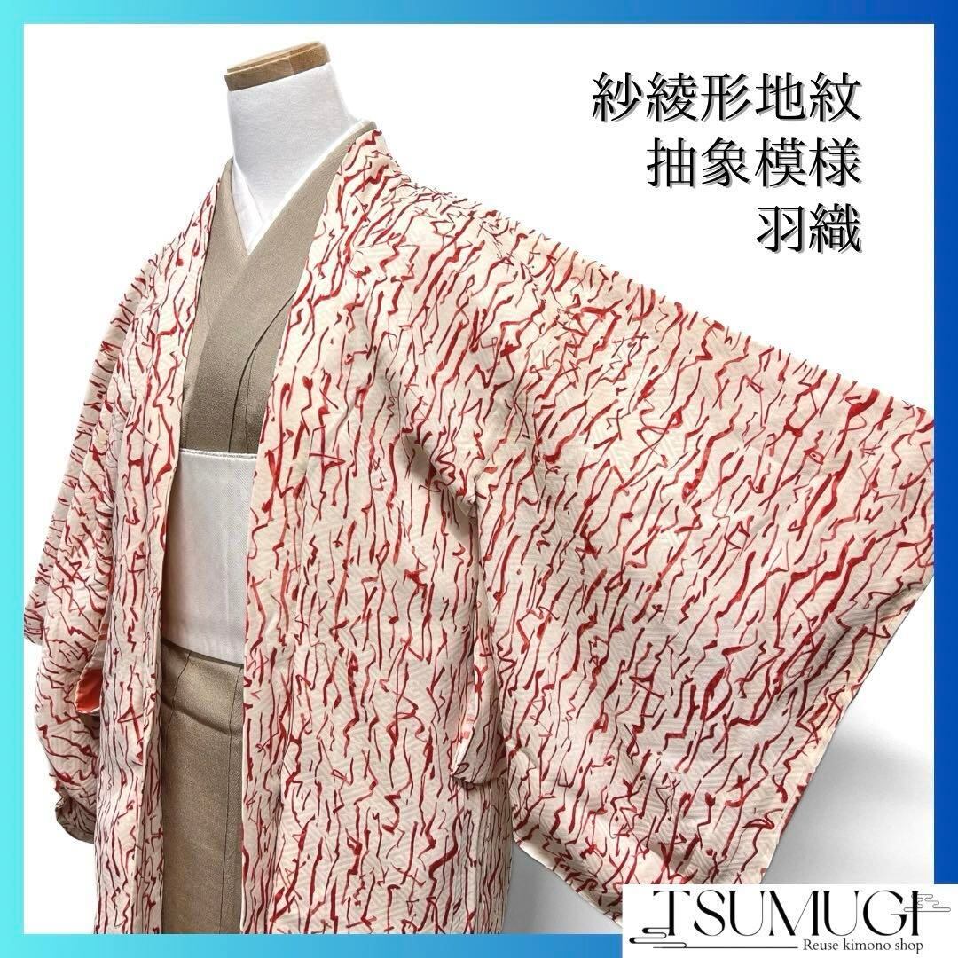 紗綾形地紋の白地に赤の抽象模様がお洒落な一着です。