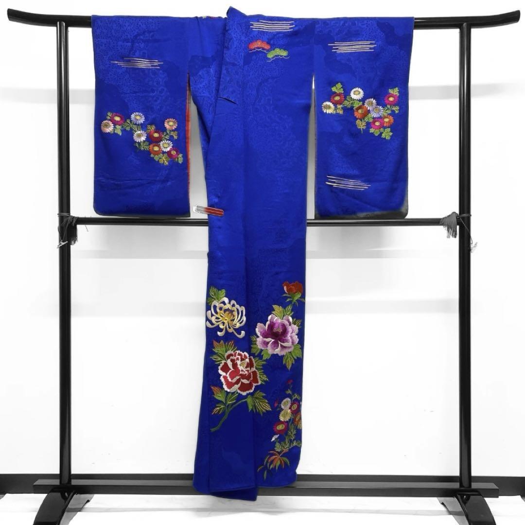 道長取りに亀甲や華紋、唐草の地紋の紫かかったブルーの地に金駒刺繍と刺繍で織られた乱菊、牡丹、菊、松、桐の花、楓が織られた華やかな一着です。