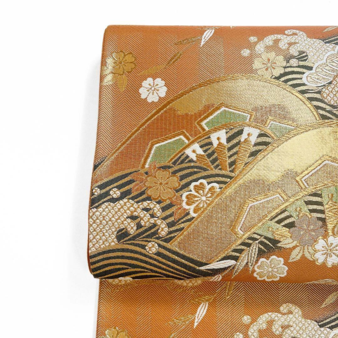 山に笹、鹿の子、花模様が織り出された袋帯です。