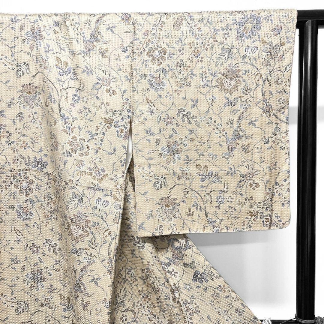 ベージュカラーに格子地紋、鳳凰や唐花模様が描かれた小紋です。