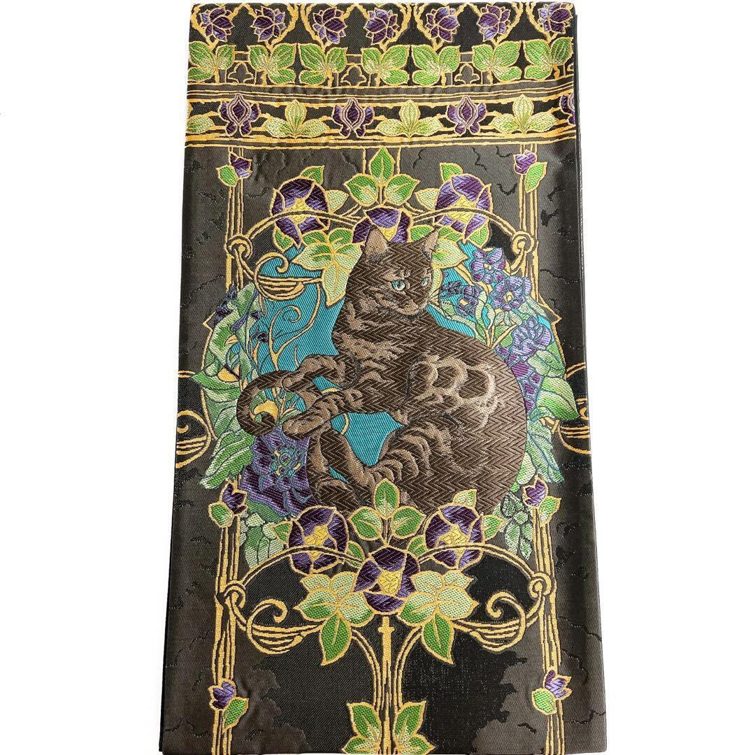 黒とグレーの背景に猫と花が唐織で織られた袋帯です。