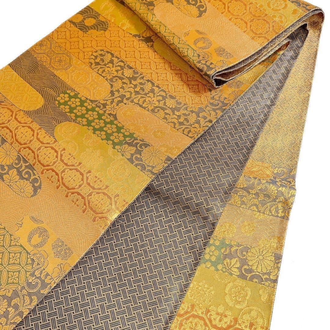 ヱ霞に七宝や菊花、唐花模様が織り出された袋帯です。