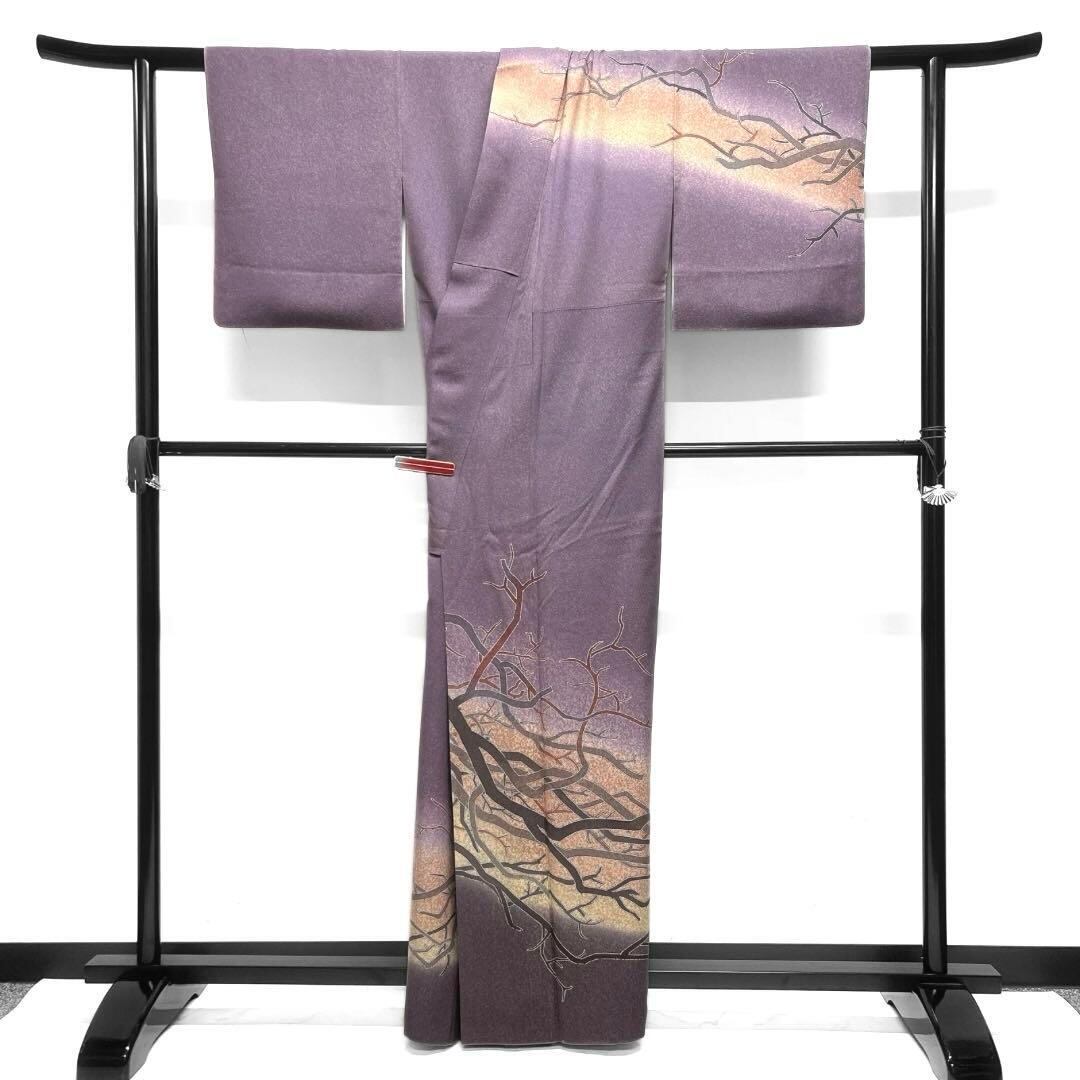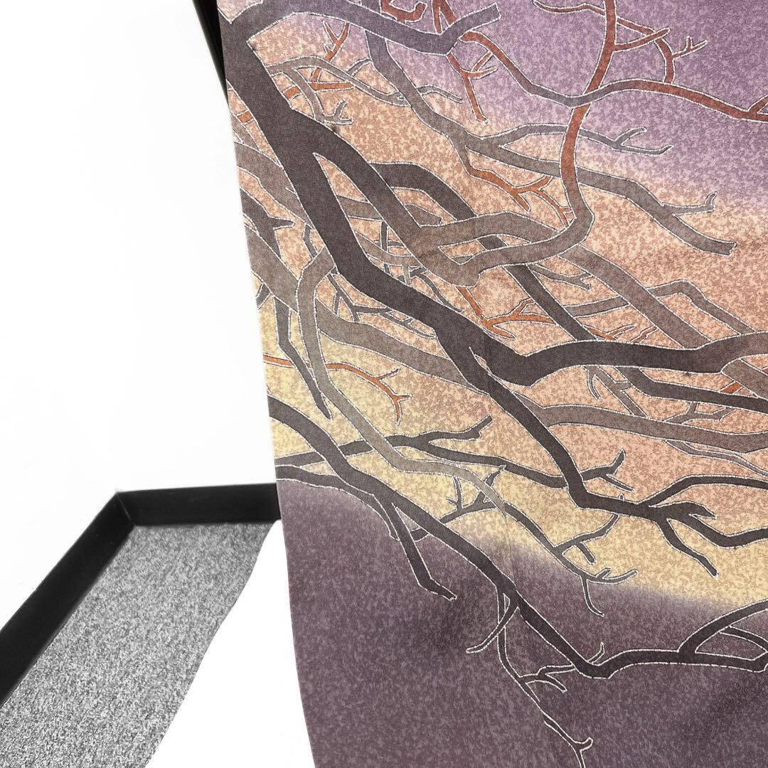 たたき染のパープルに夕焼けが差すようなオレンジのグラデーション地にツリー模様が描かれたお洒落な雰囲気の一着です。