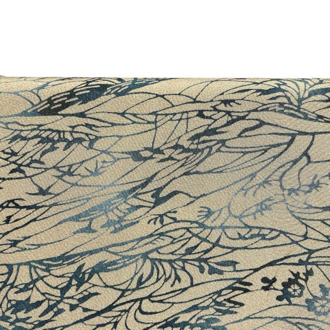 くすんだイエローの地にグラデーションがかった型染で描かれた波や花模様、リーフの文様がお洒落な一着です。