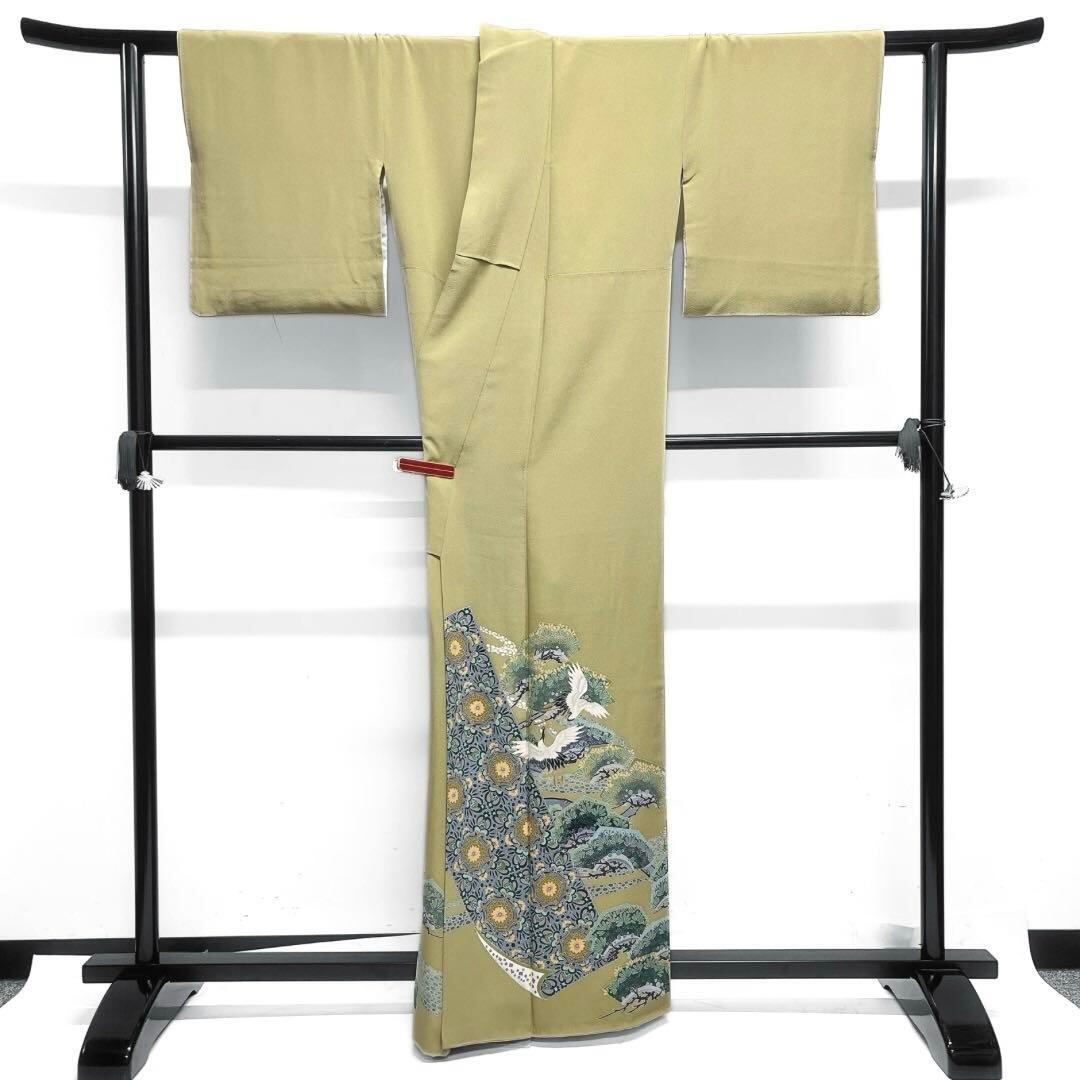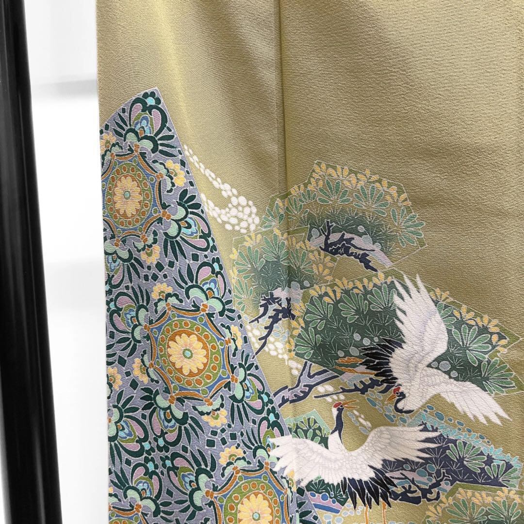 芥子色の地に本加賀友禅で描かれた短冊に華紋と鶴と松の文様が華やかで絢爛な一着です。