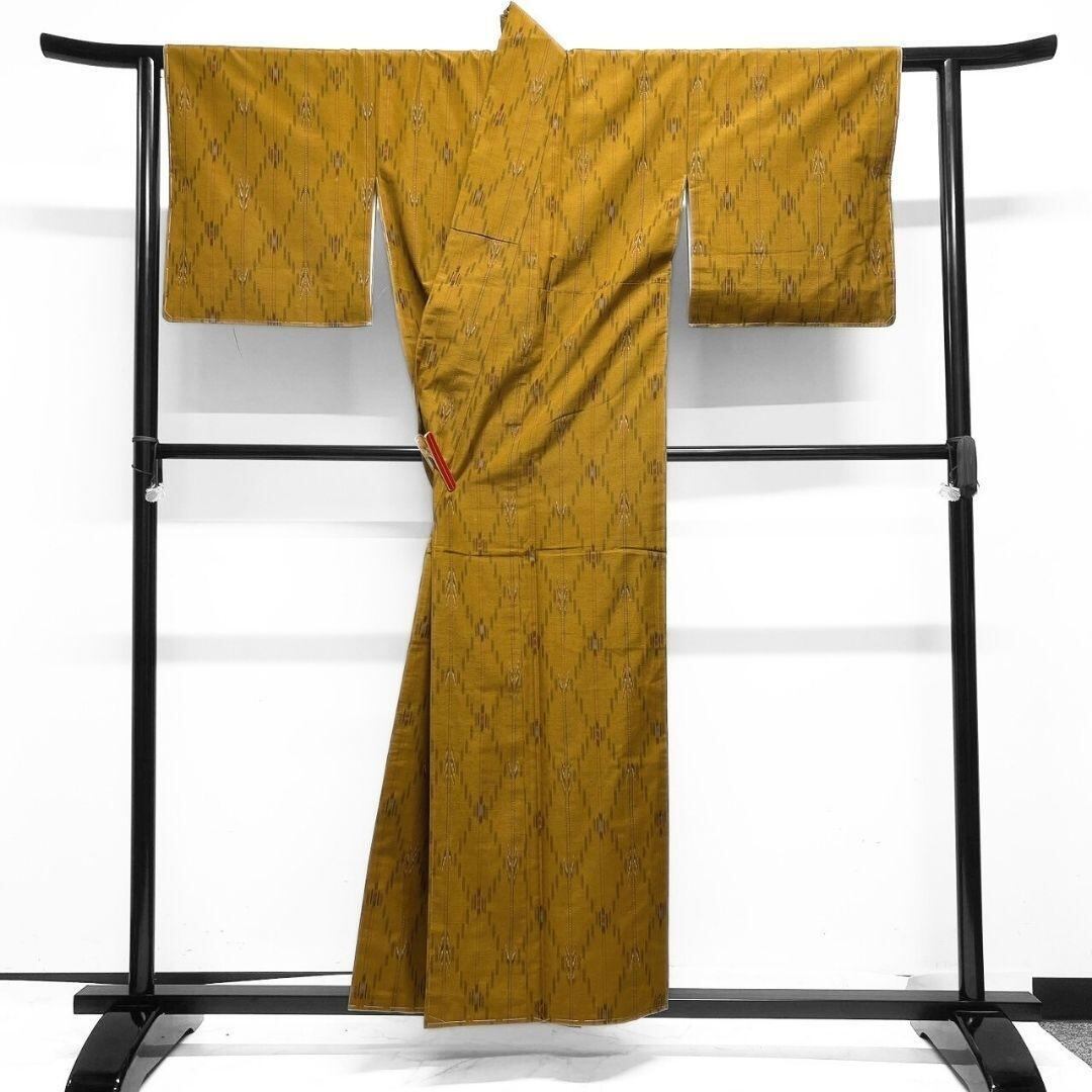 手織り、陽彩紬の縦縞に絣、菱模様が織り出された小紋です。