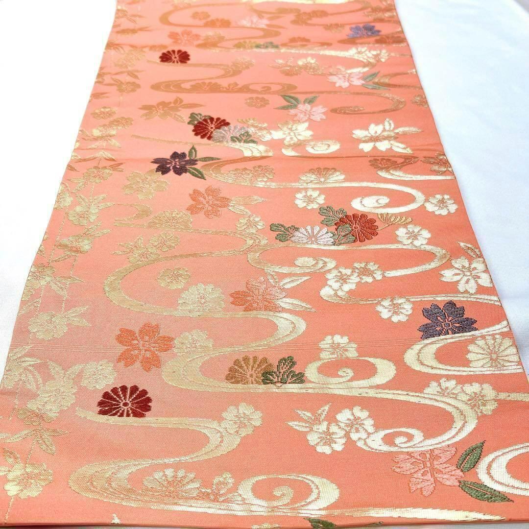 目を惹くサーモンピンクの色使い、流れるような花模様が美しい印象の1着です。