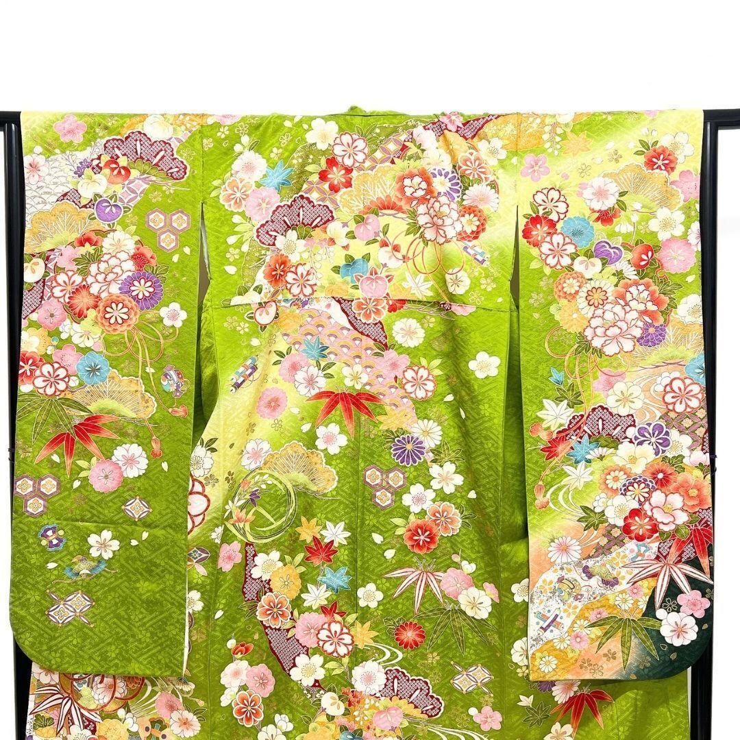 松竹梅に鮮やかなお色味の振袖、流線に花模様の織り出し袋帯のセットです。
