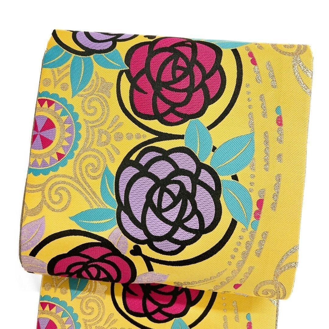 エメラルドグリーンのお色味に黄色の薔薇が織り出された袋帯のセットです。