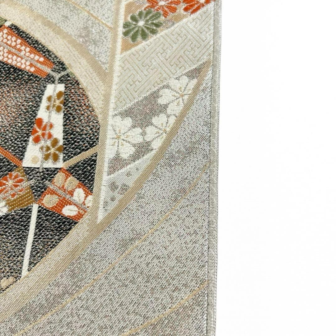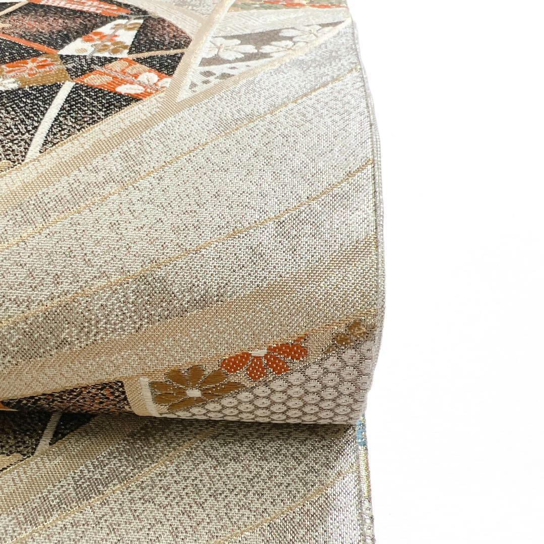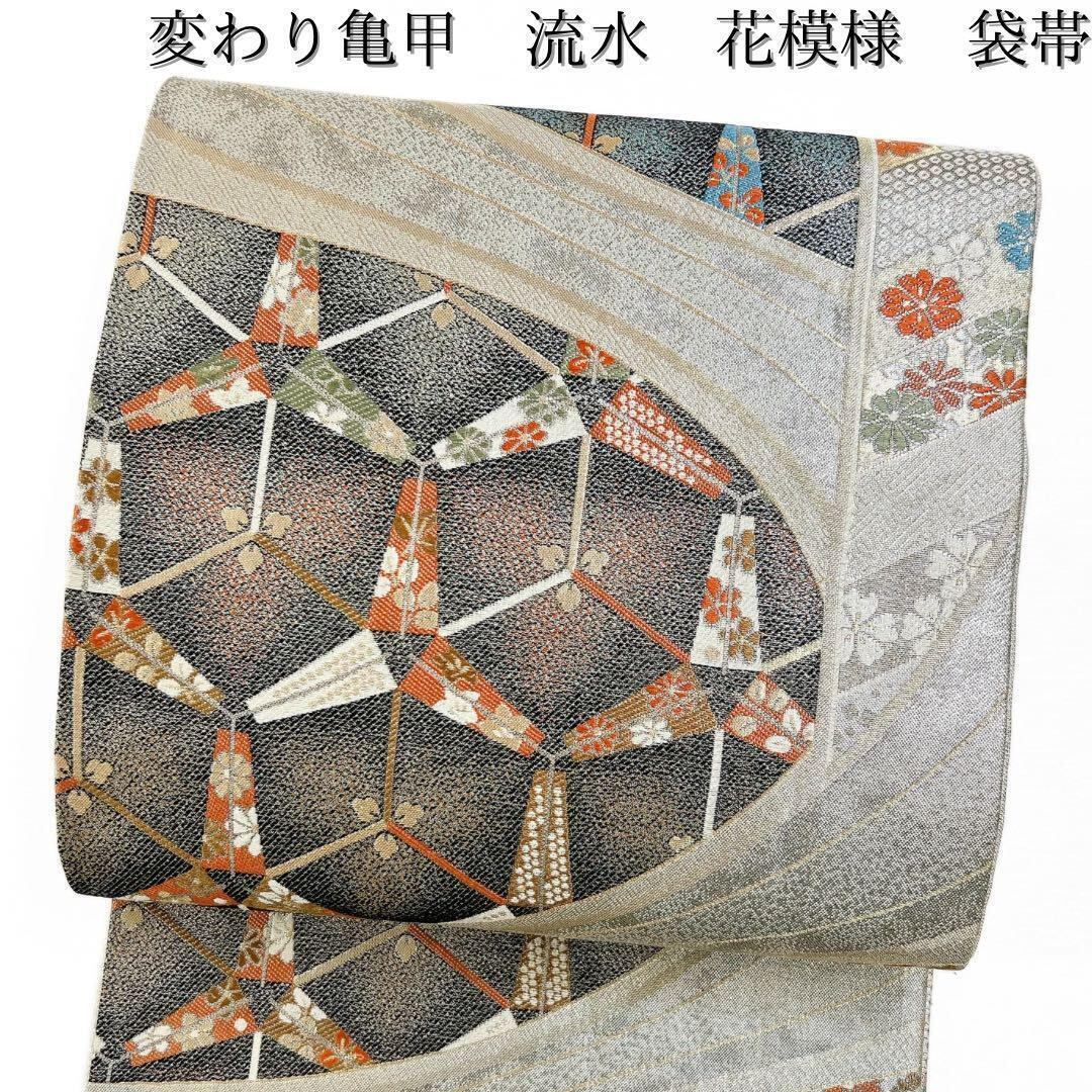縦に織られた流水と斜め縞に花模様と変わり亀甲の文様が華やかな一着です。