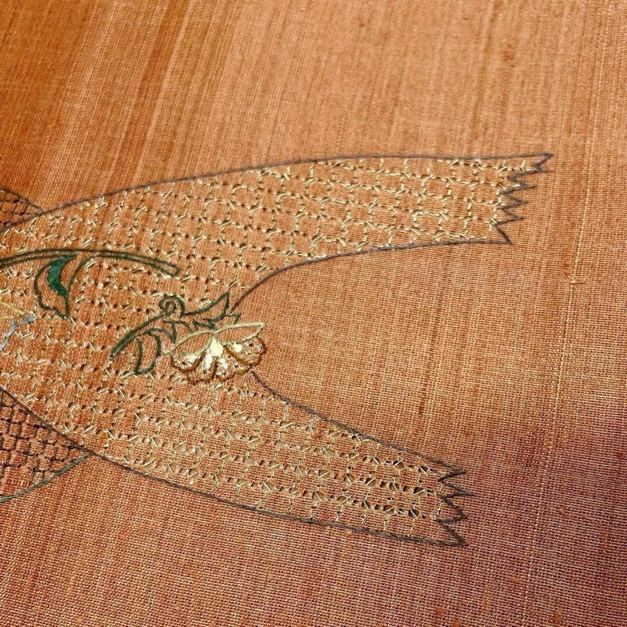 ブラウンの紬地に抽象模様のスワトウ刺繍に唐花の刺繍がお洒落な一着です。