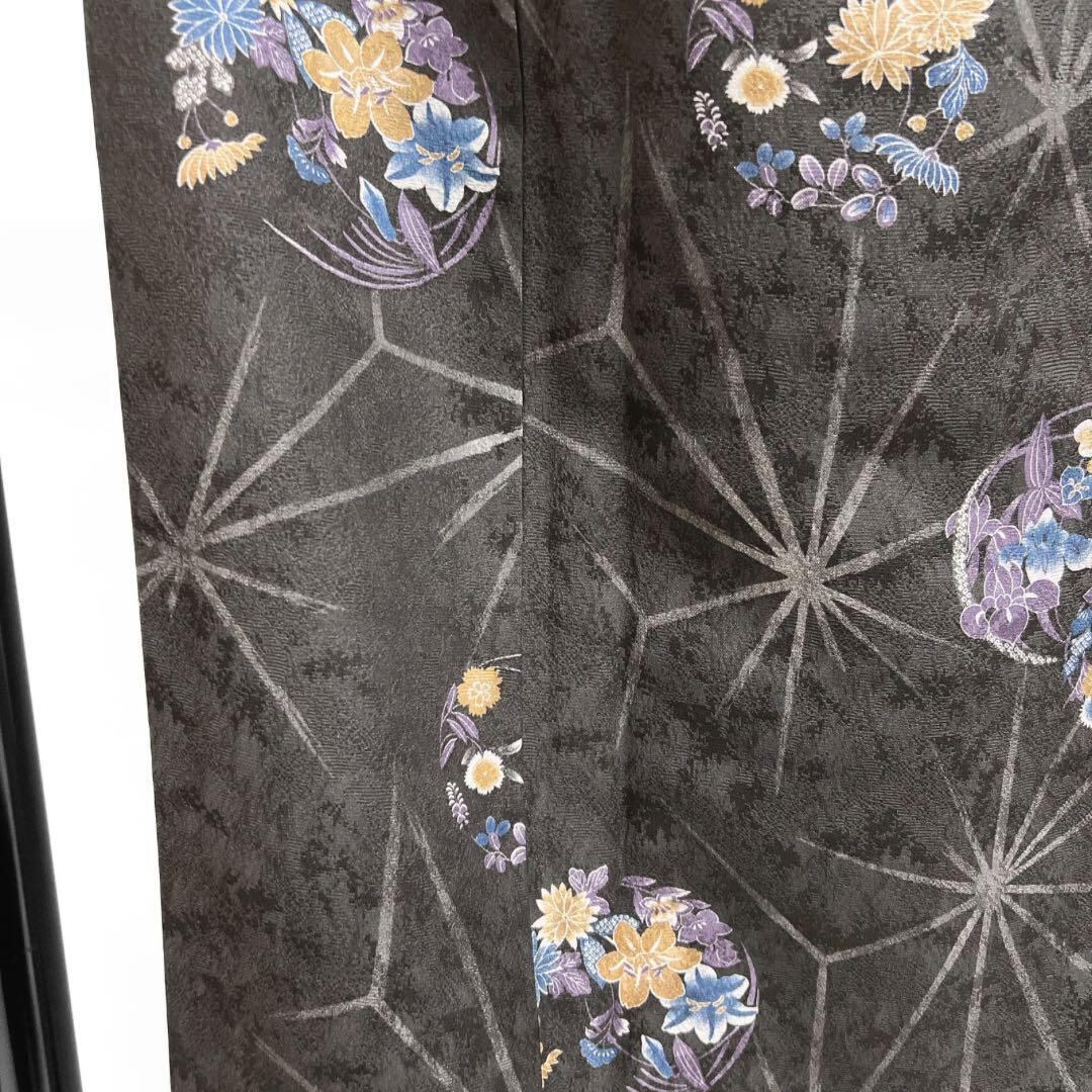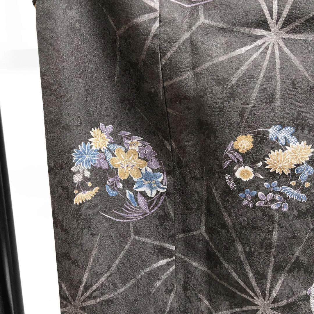 グレーの地に麻の葉文様と様々な花紋が描かれた華やかなデザインの一着です。