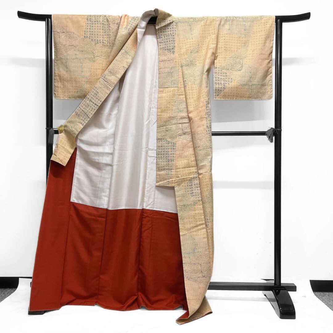 ベージュの紬地に裂取りに菊や抽象模様が描かれたお洒落な一着です。