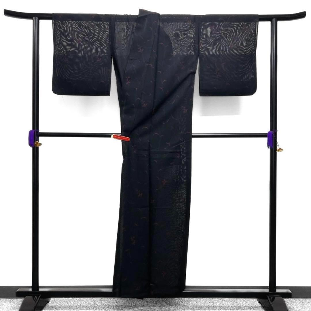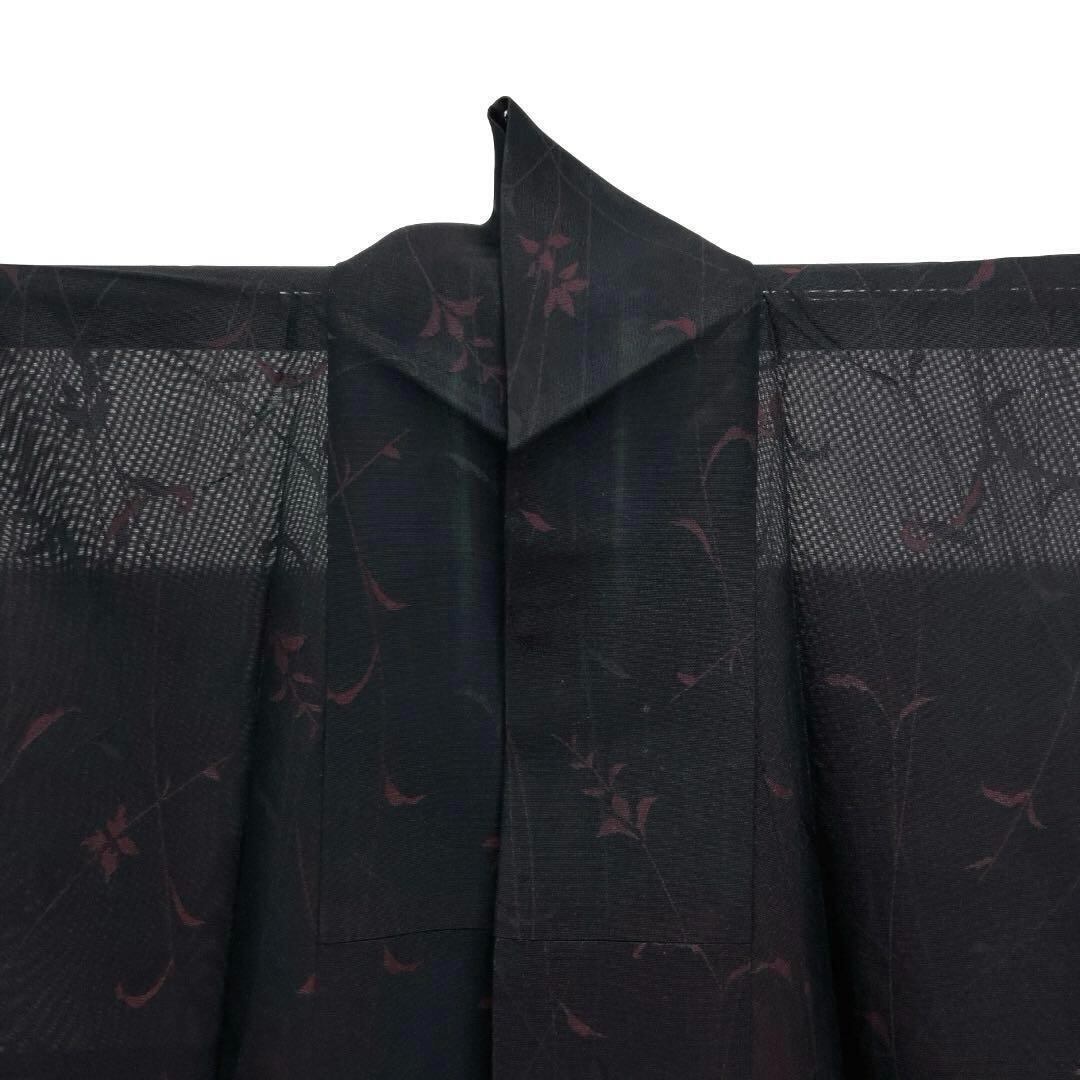 表に黒地、裏地にワインレッドの二重紗地に蔦とリーフが織られたお洒落な一着です。