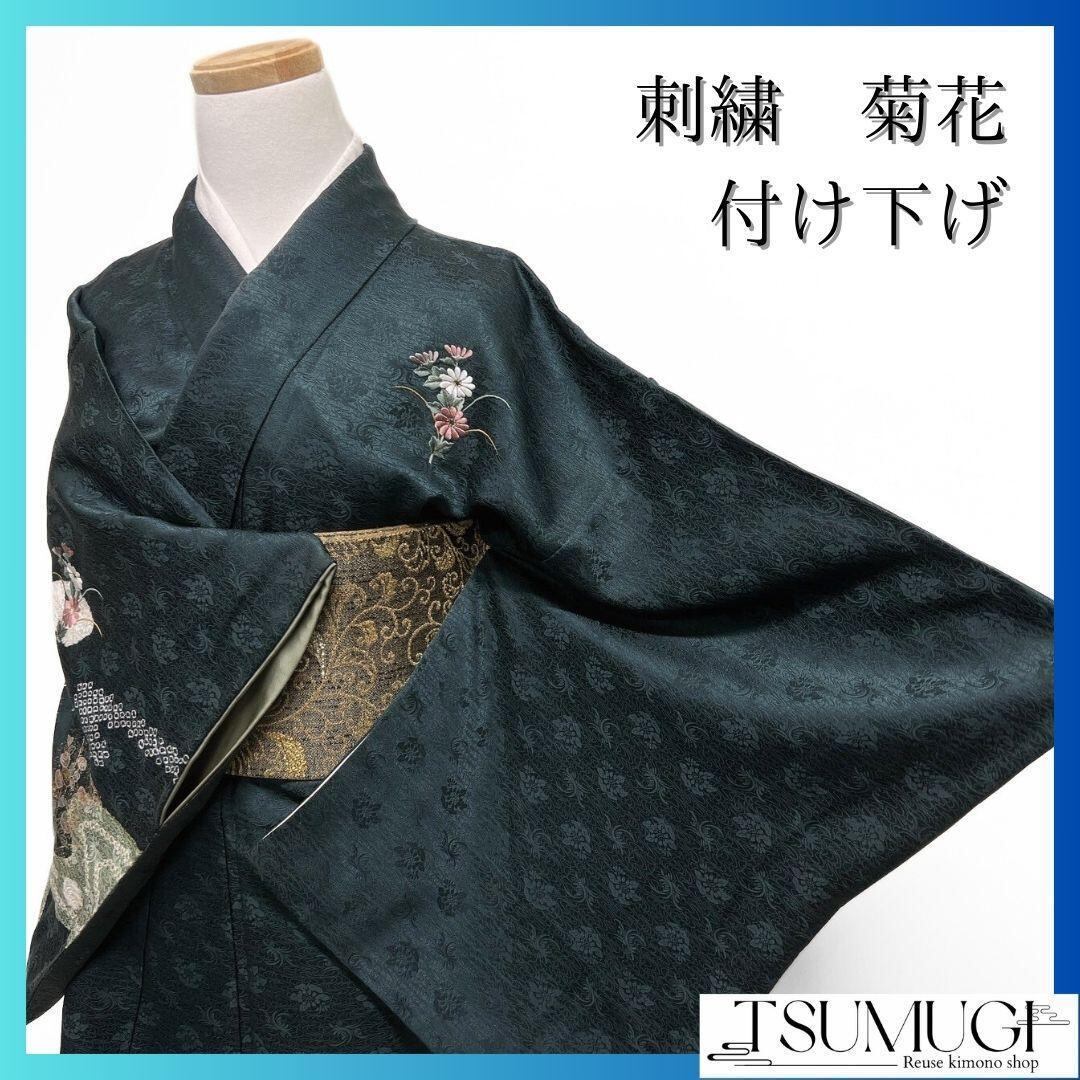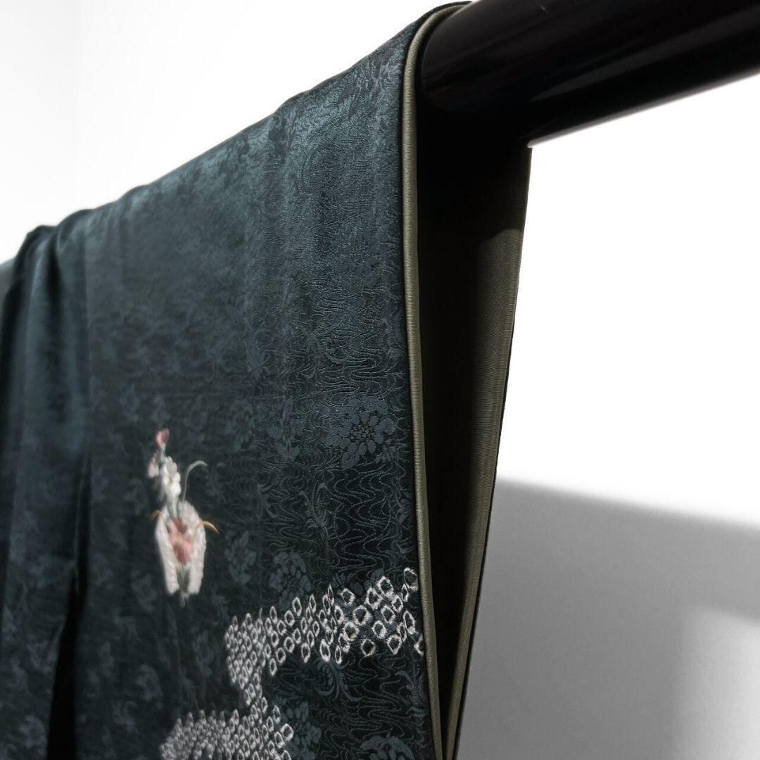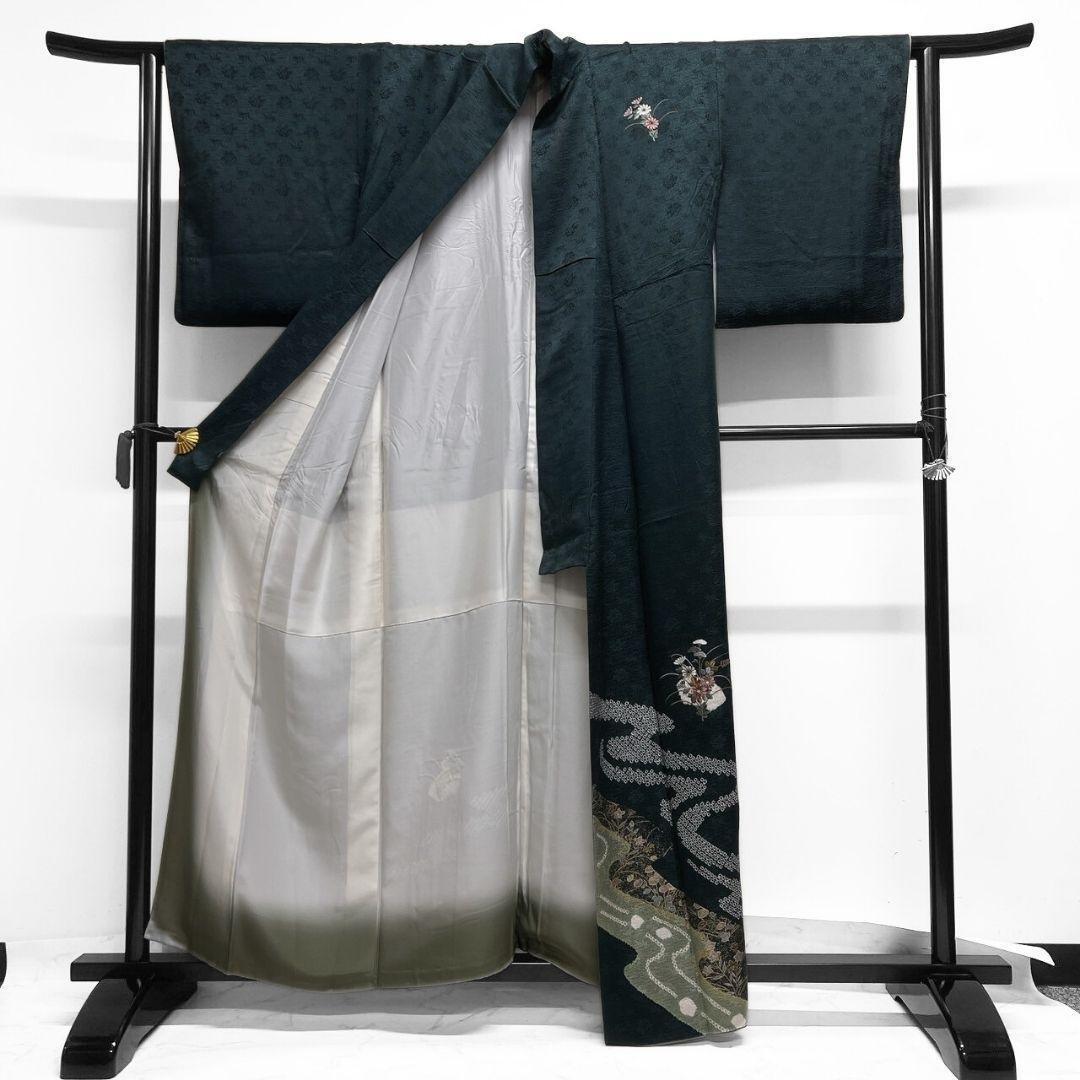 流水に刺繍があしらわれた美しい菊花や萩がデザインされた一着です。
