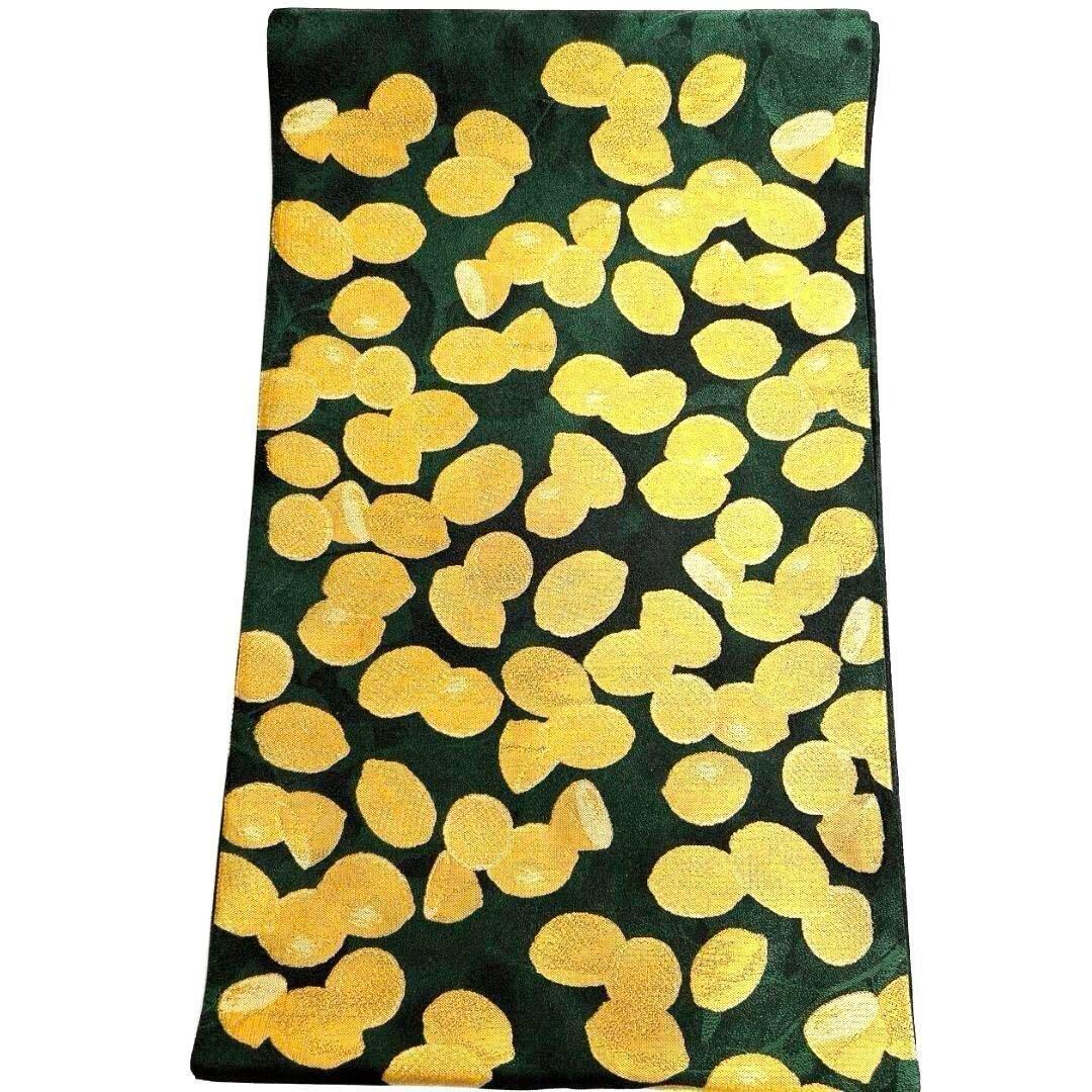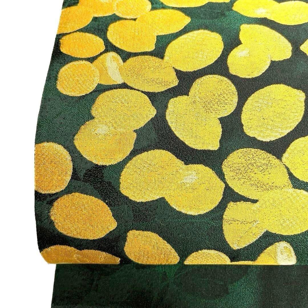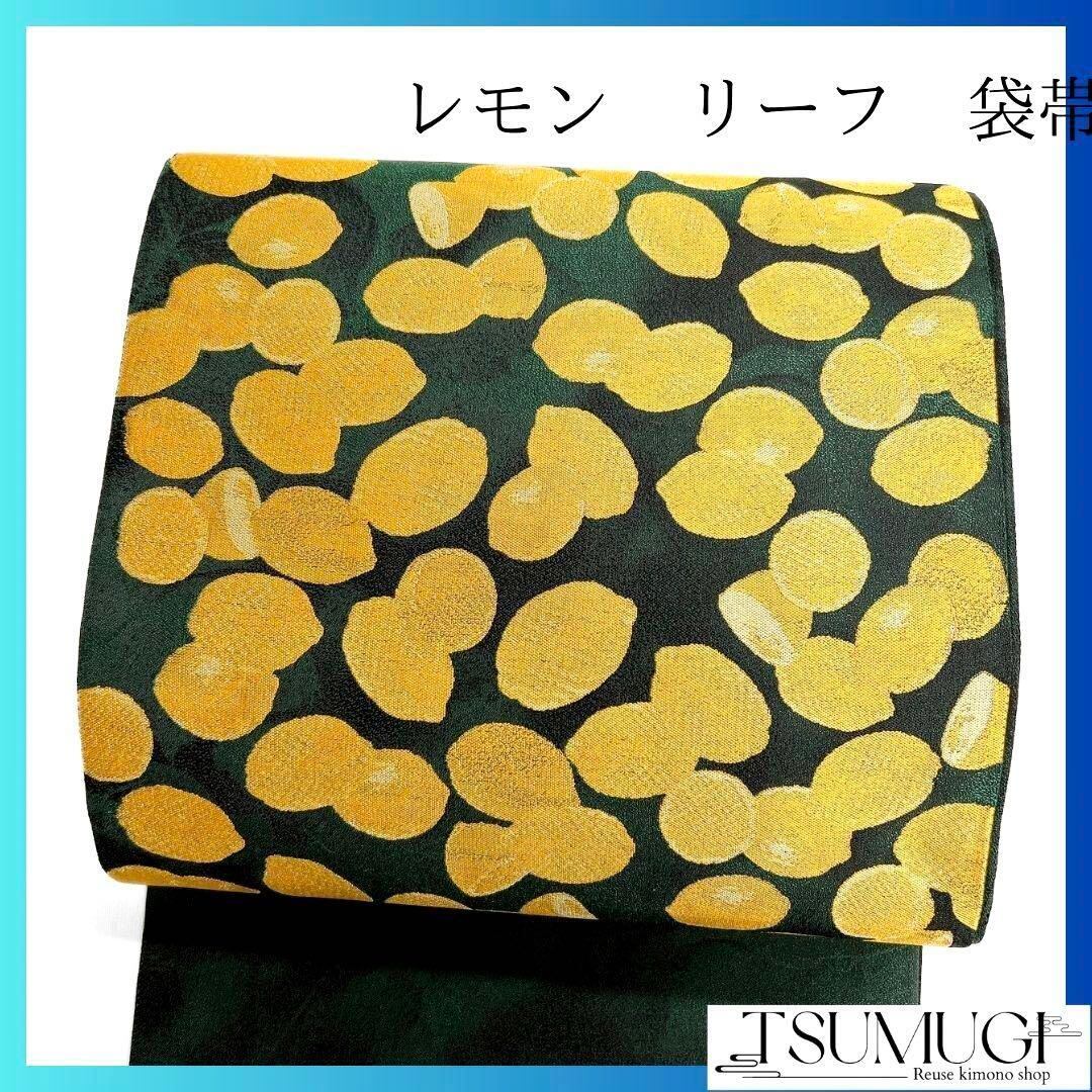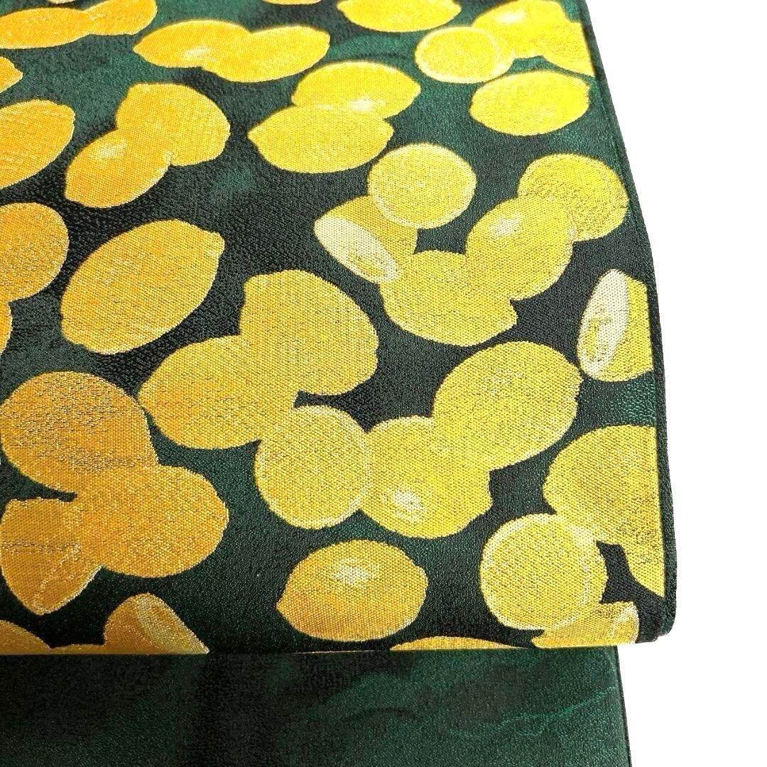 ダークトーンに鮮やかなレモンの実が織り出された珍しいデザインの一着です。