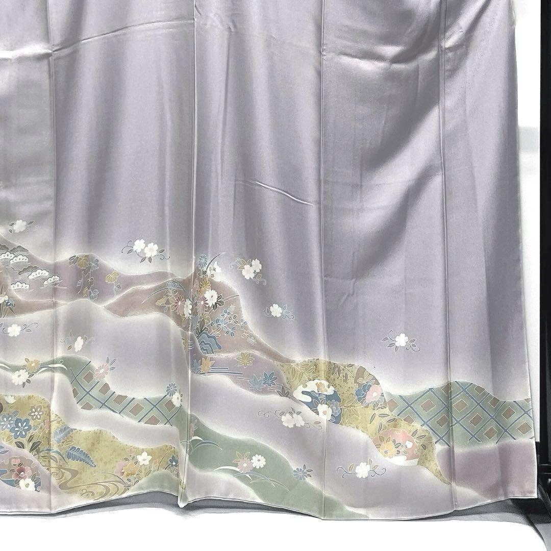 くすみパープル地に流水に金駒刺繍の菊や様々な花模様や雪輪紋が描かれた華やかな一着です。