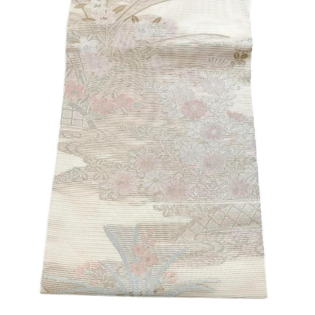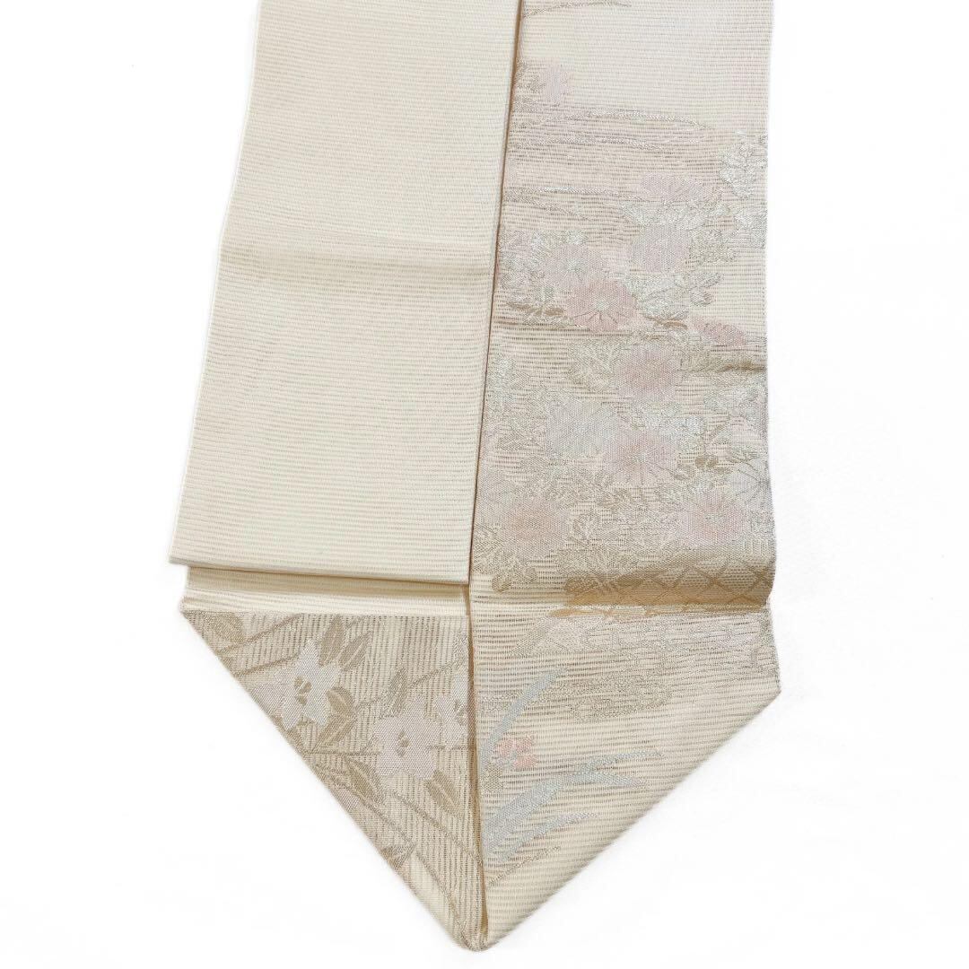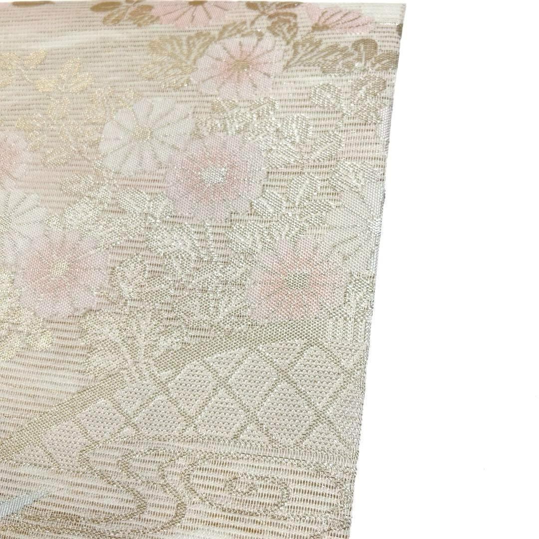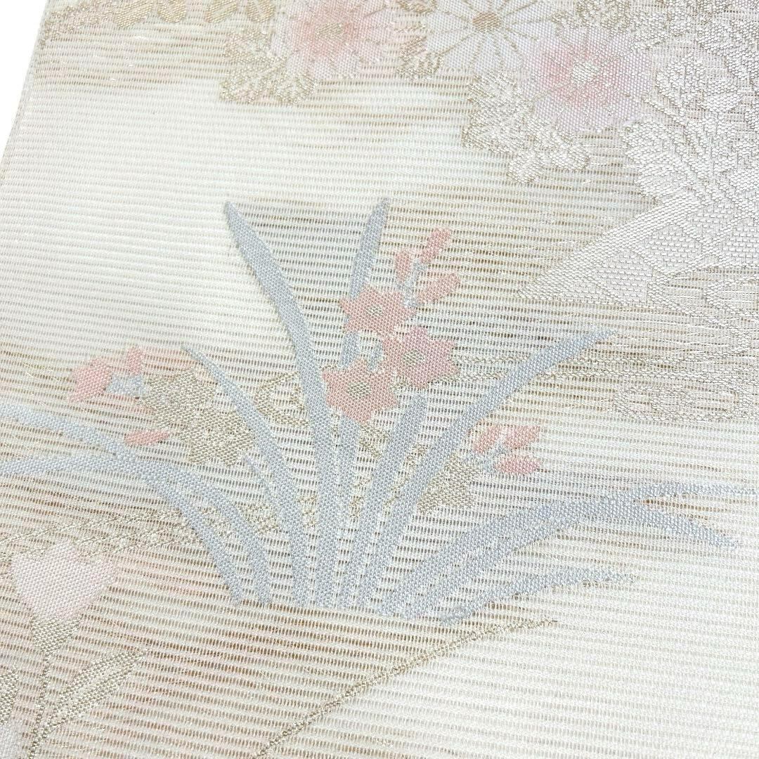 オフホワイトの絽の地に菊と桔梗などの花模様が金と淡い色使いで織られた華やかな一着です。