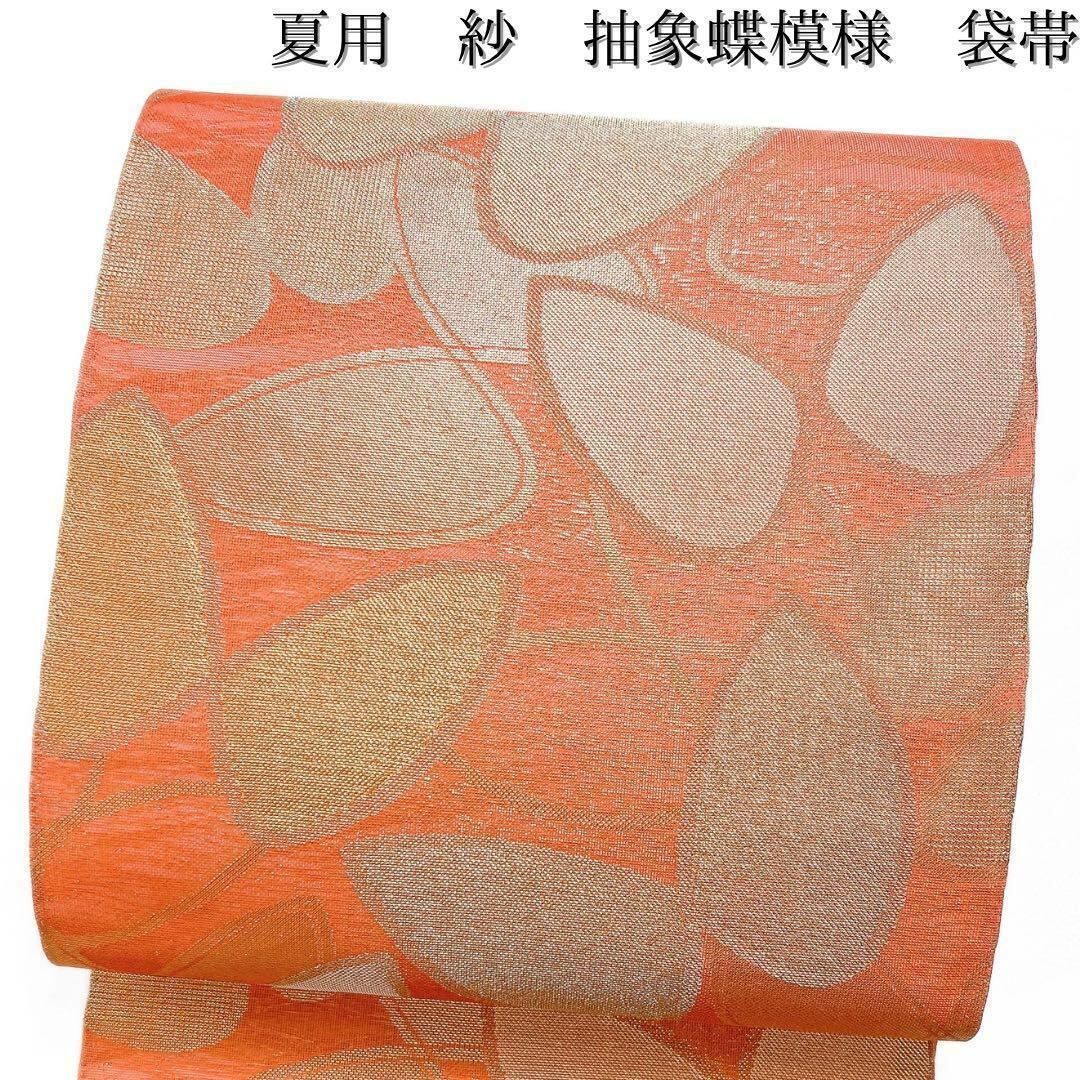 紗のピンクのかかったオレンジ色地に金の掬いと抽象的に描かれた蝶の文様がお洒落な一着です。