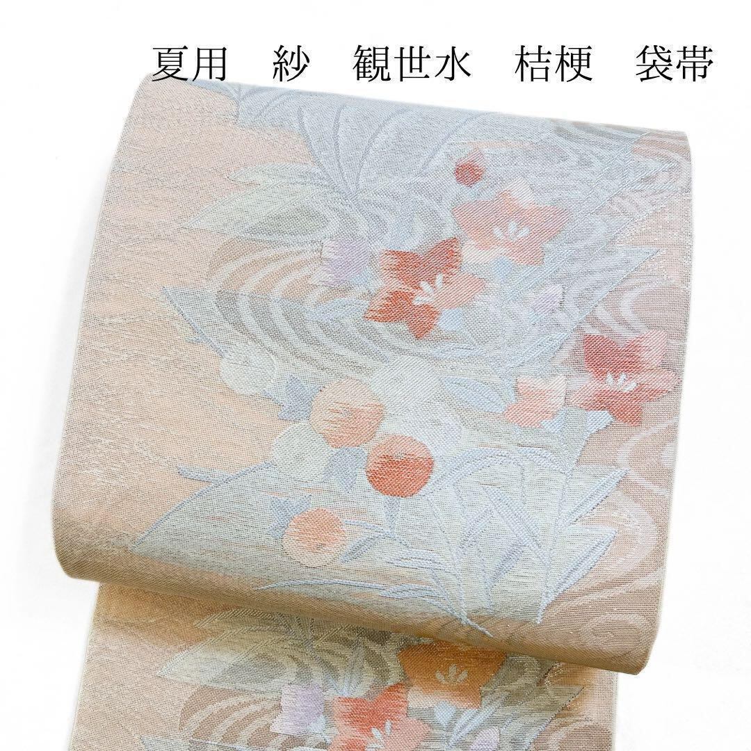 夏用、紗に観世水と桔梗、遠山が織り出された袋帯です。