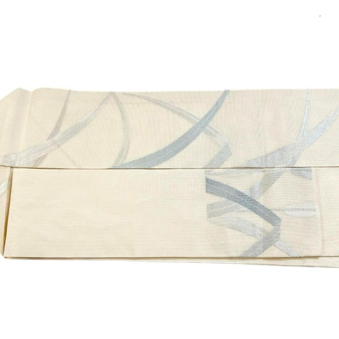 オフホワイトの紗の地にくすみカラーの水色と銀色で織られたリーフ模様がお洒落な一着です。