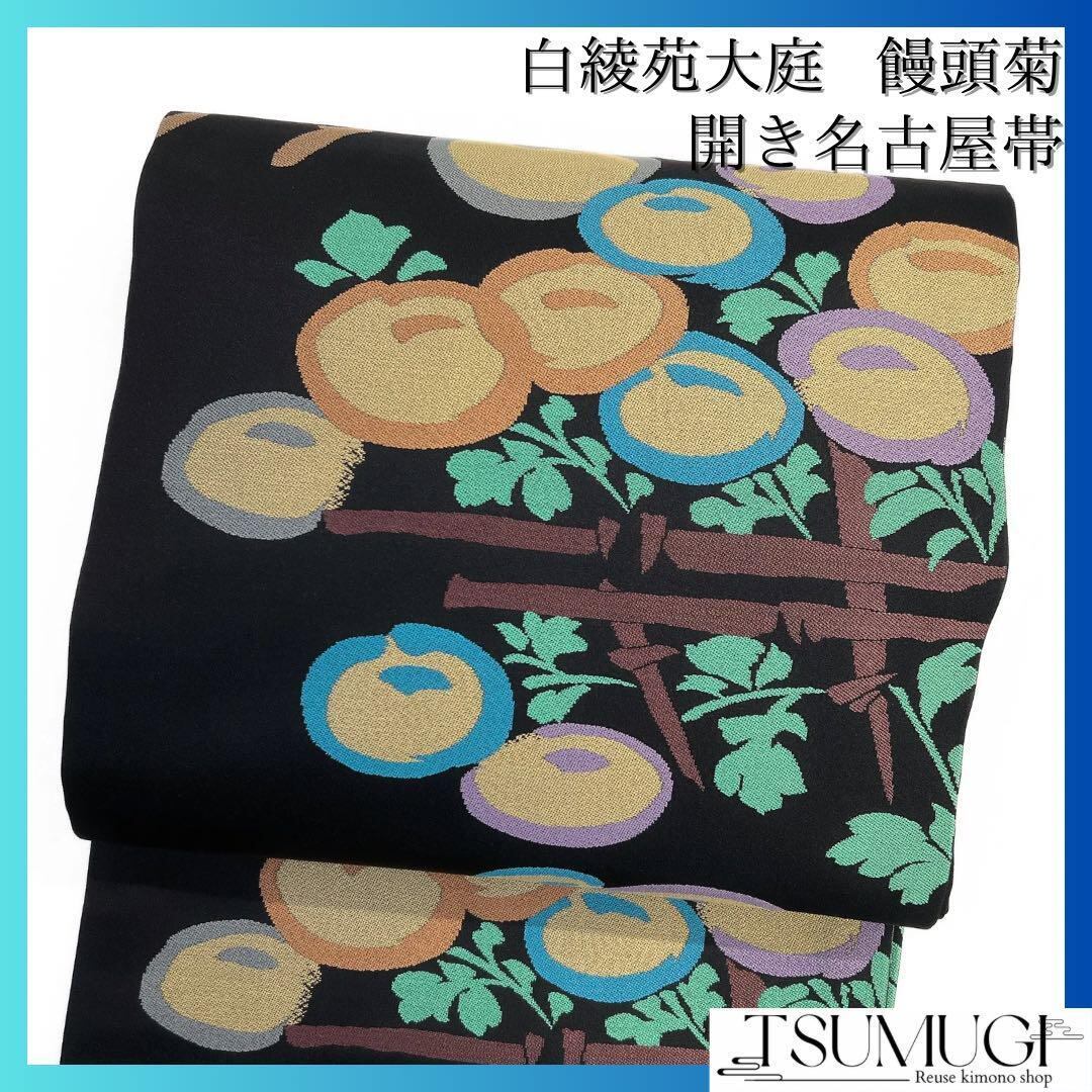 白綾苑大庭の饅頭菊の織られた開き名古屋帯です。