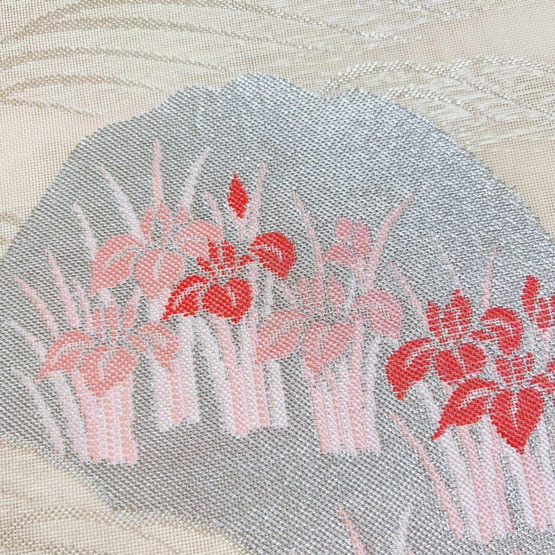 紗の白地に銀で織られた波と水辺模様に菖蒲と花模様が織られたお洒落な一着です。