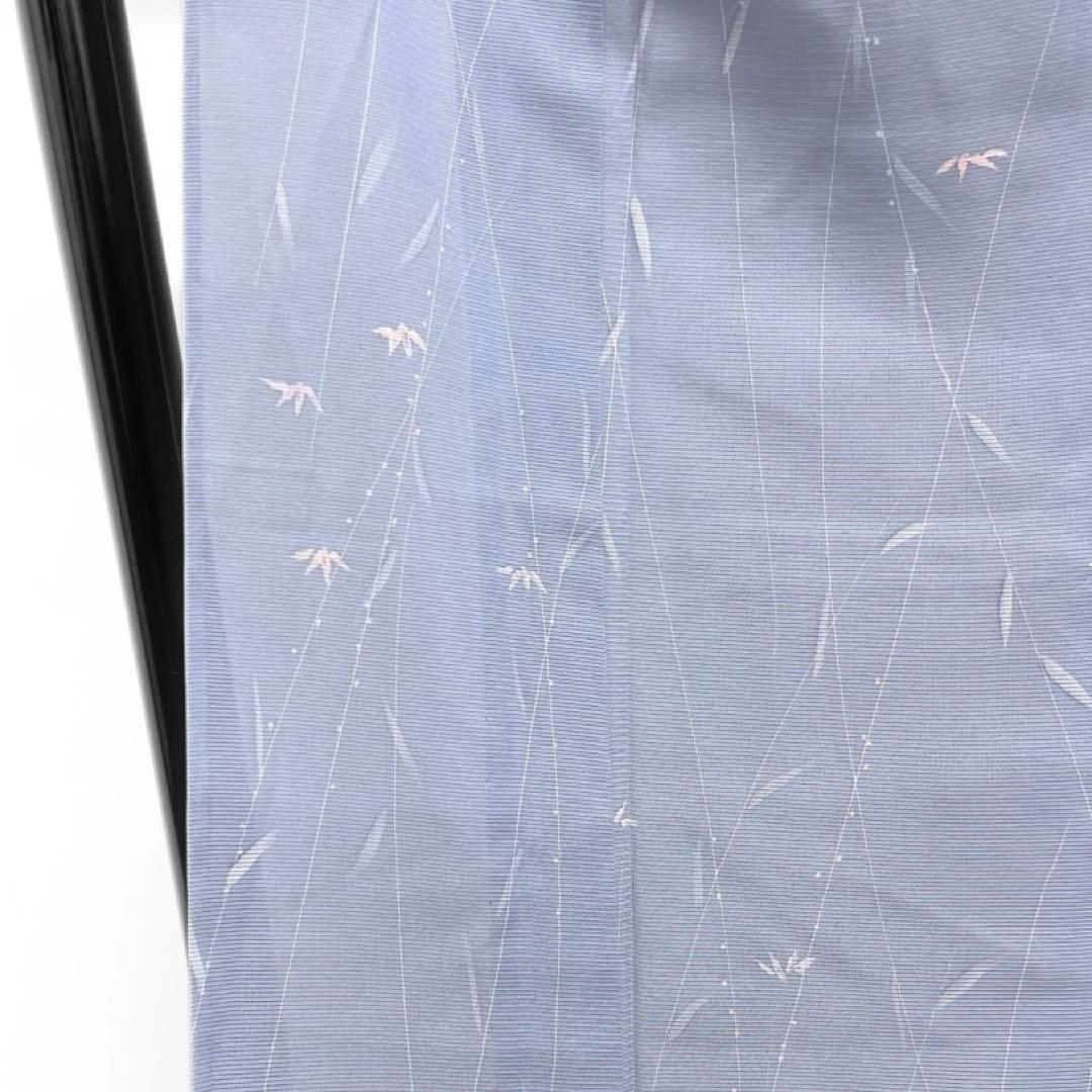 薄い青みのあるパープル地に流線と雫のように描かれたドットと竹の文様がお洒落な一着です。