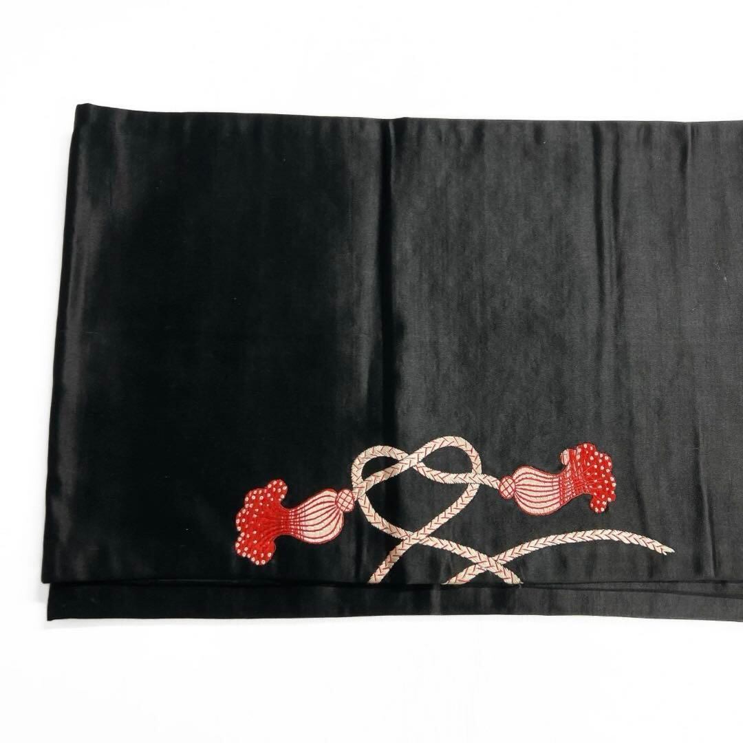 黒地に刺繍の打ち出の小槌や花模様、水引が織られた華やかなデザインの一着です。