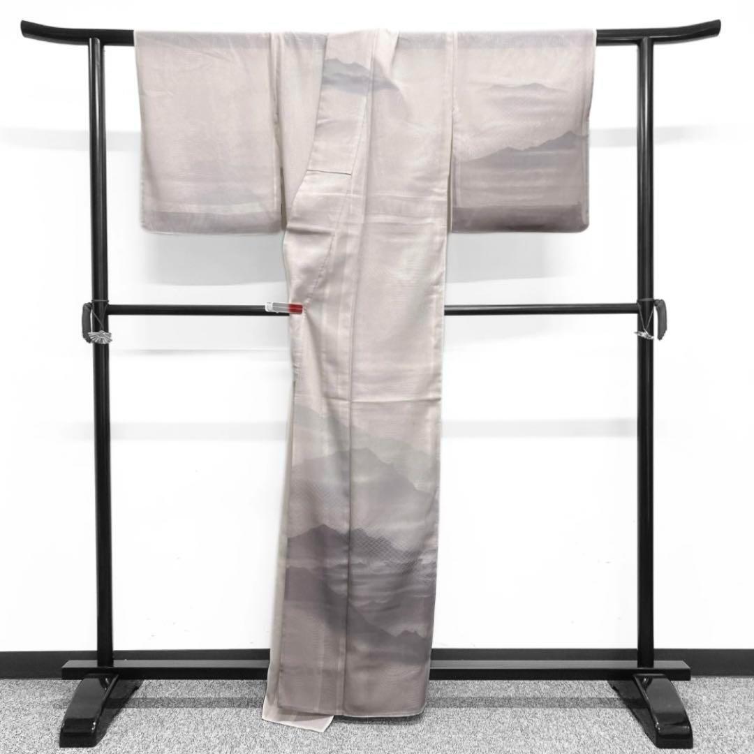 ジグザグ模様のくすんだ薄い紗のベージュ地とオフホワイトの紗の裏地による紗無双に遠山模様がお洒落な一着です。