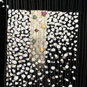黒地の縦絽にのり散らしで描かれた変わり市松模様に刺繍の文様が可愛らしい上品でお洒落な一着です。
